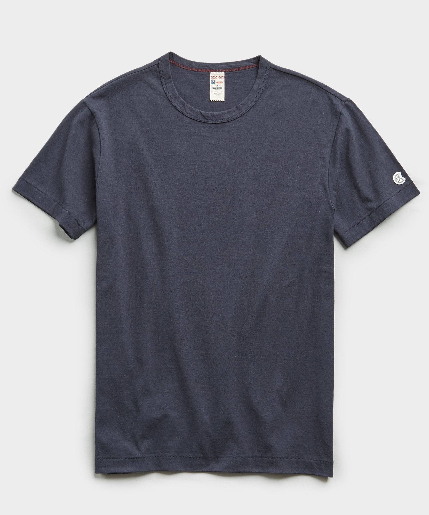 Part of our Foundation Collection — premium knitwear that plays equally well with sweats or suits — this essential tee is crafted from quality 9-oz cotton jersey in a family-owned factory in Toronto, using vintage flat-lock machines. Considered details such as red cover-stitching at the back of the neck, a self-fabric bound neck, contrast sand colored stitching and the iconic logo nod to Champion’s athletic heritage while elevating an everyday basic. Softly tailored for a relaxed yet refined look, it looks great on its own or as your favorite base layer. Created in collaboration with iconic American athletic brand Champion Sportswear, and exclusively designed and manufactured by Todd Snyder.