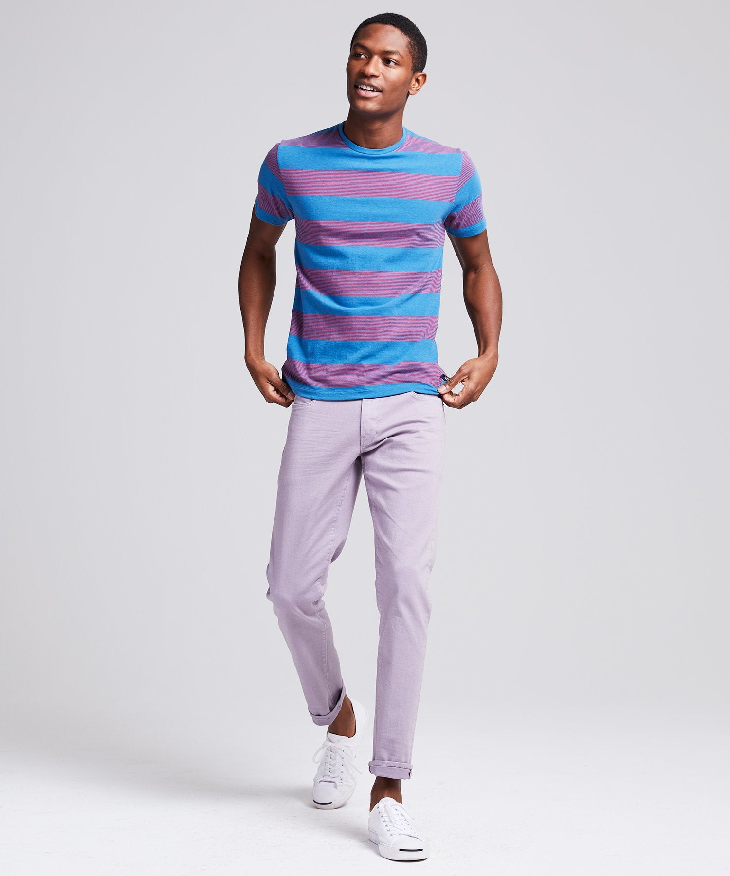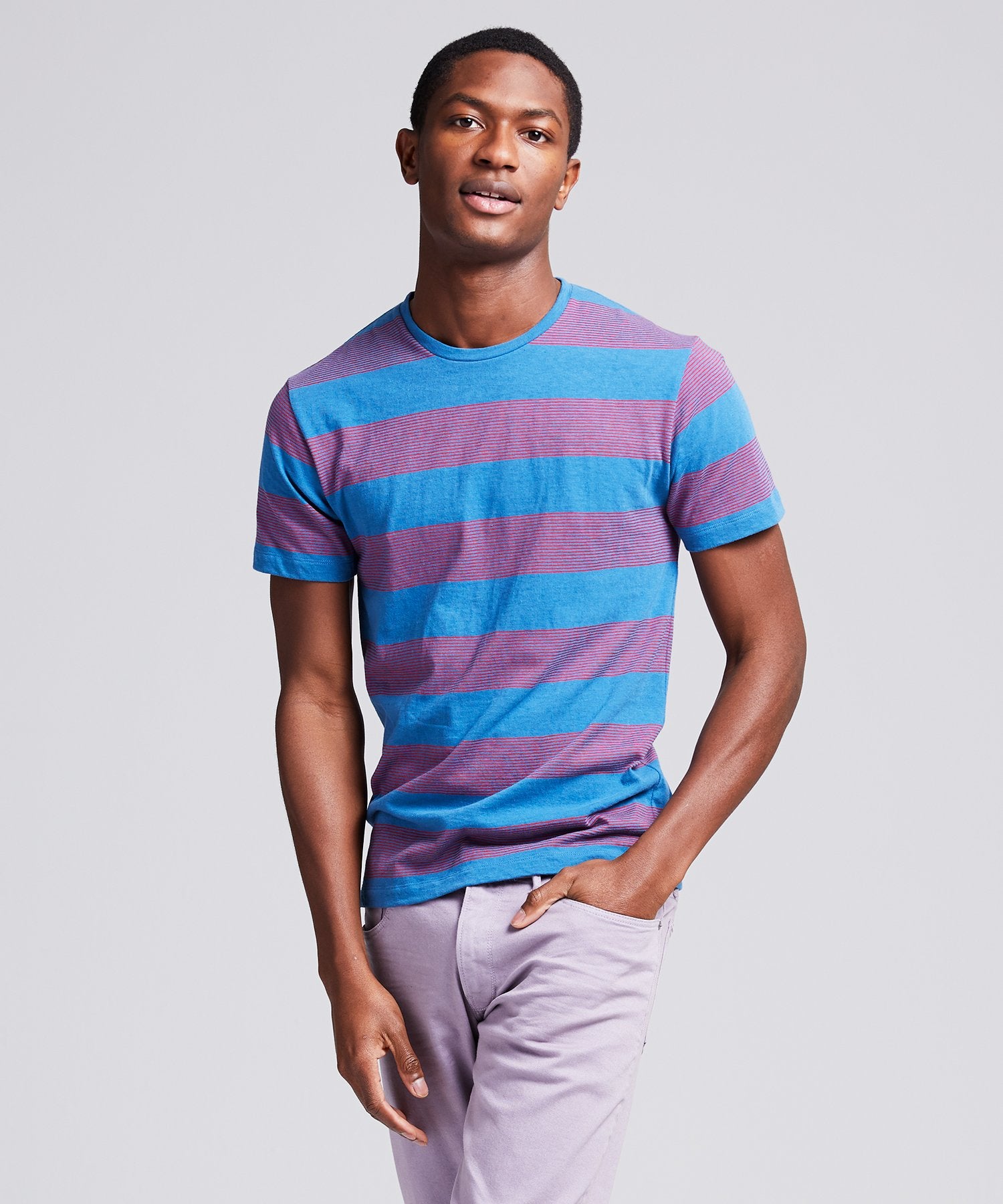 This is versatile mid-weight t-shirt is crafted from 100% cotton jersey fabric from Portugal with a substantial feel, for more structure and heft than our basic tees. Detailed with a vintage-inspired custom stripe, this is a goes-with-everything transitional essential that riffs on a retro-prep vibe.