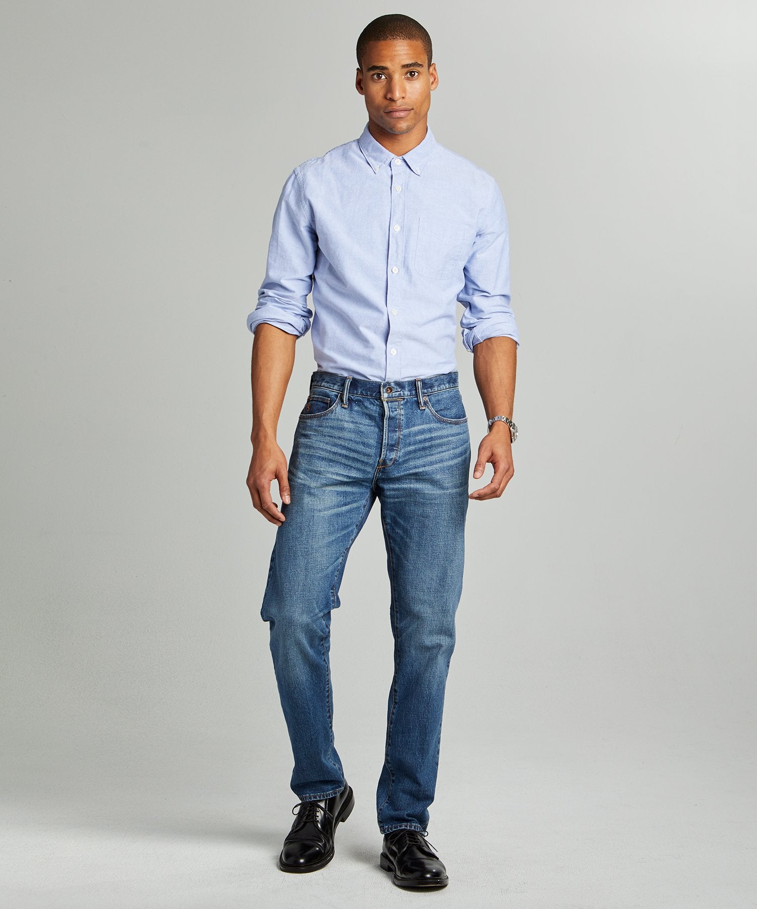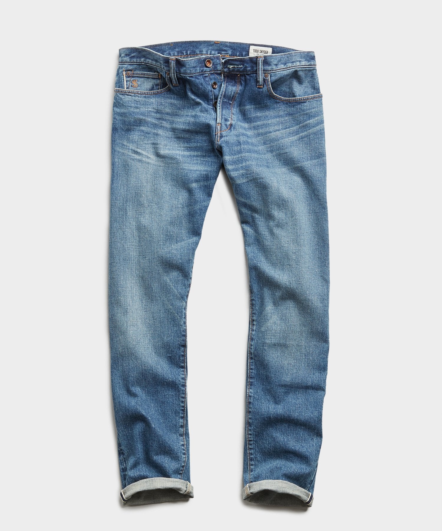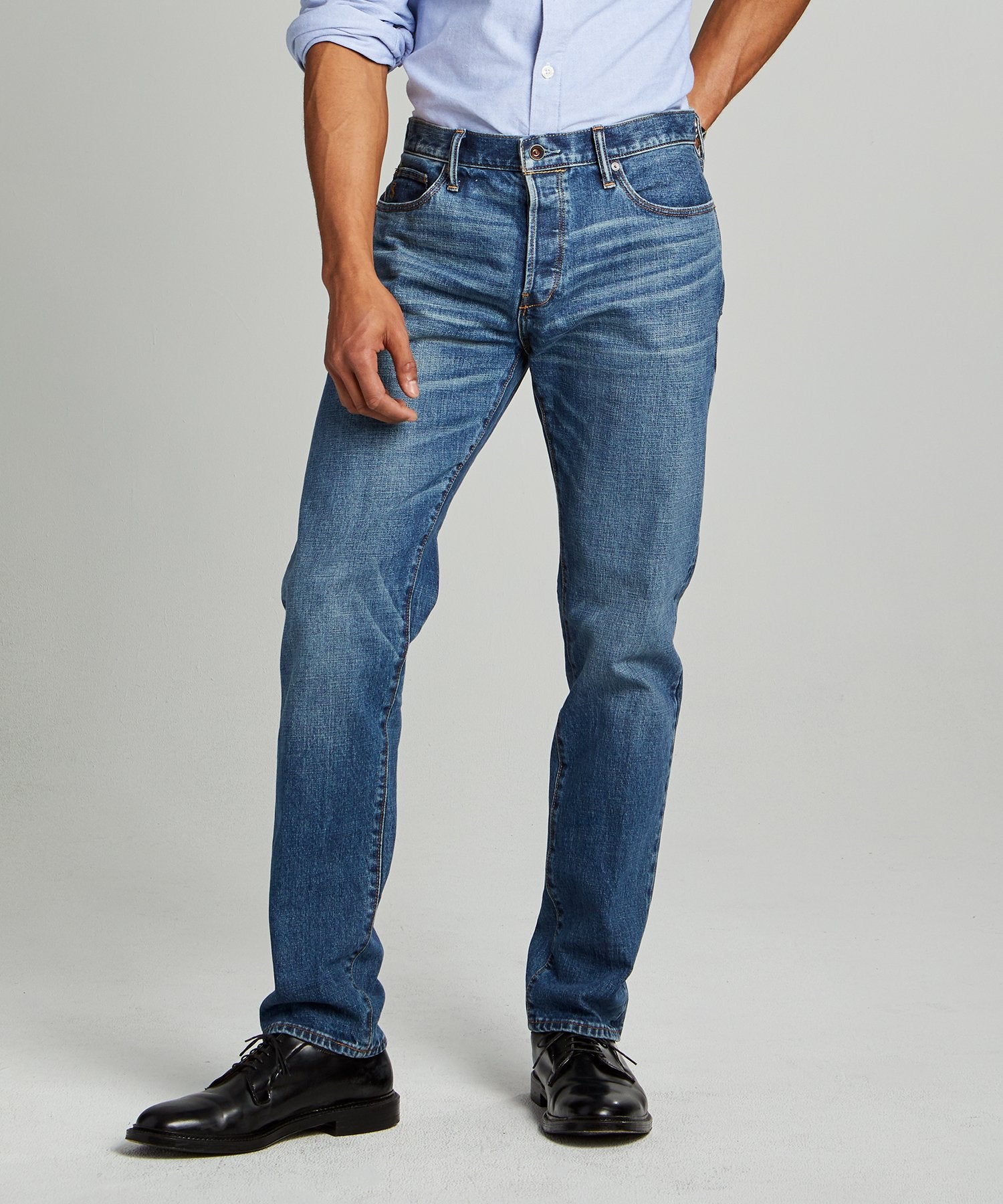 Cut with a new custom straight fit from premium Japanese stretch selvedge fabric, this pair has a medium wash for an authentic vintage look and feel without heavy wear and tear. The authentic worn-in jean features signature detailing; three-color topstitching, handmade durable herringbone pocketing, branded inner pocket, and Todd Synder-embossed suede back patch. Styled with a button fly, this new signature style is our take on the American icon, destined to become a new favorite in your denim collection.