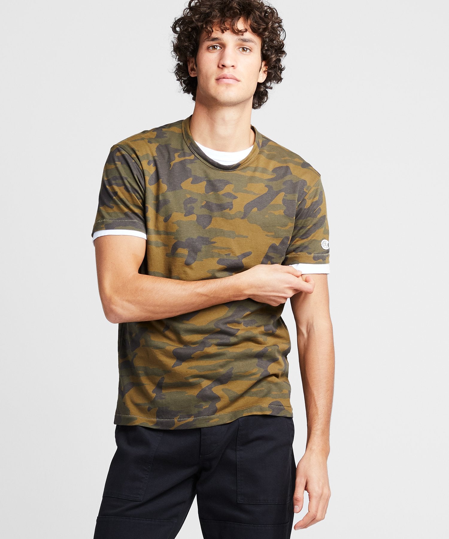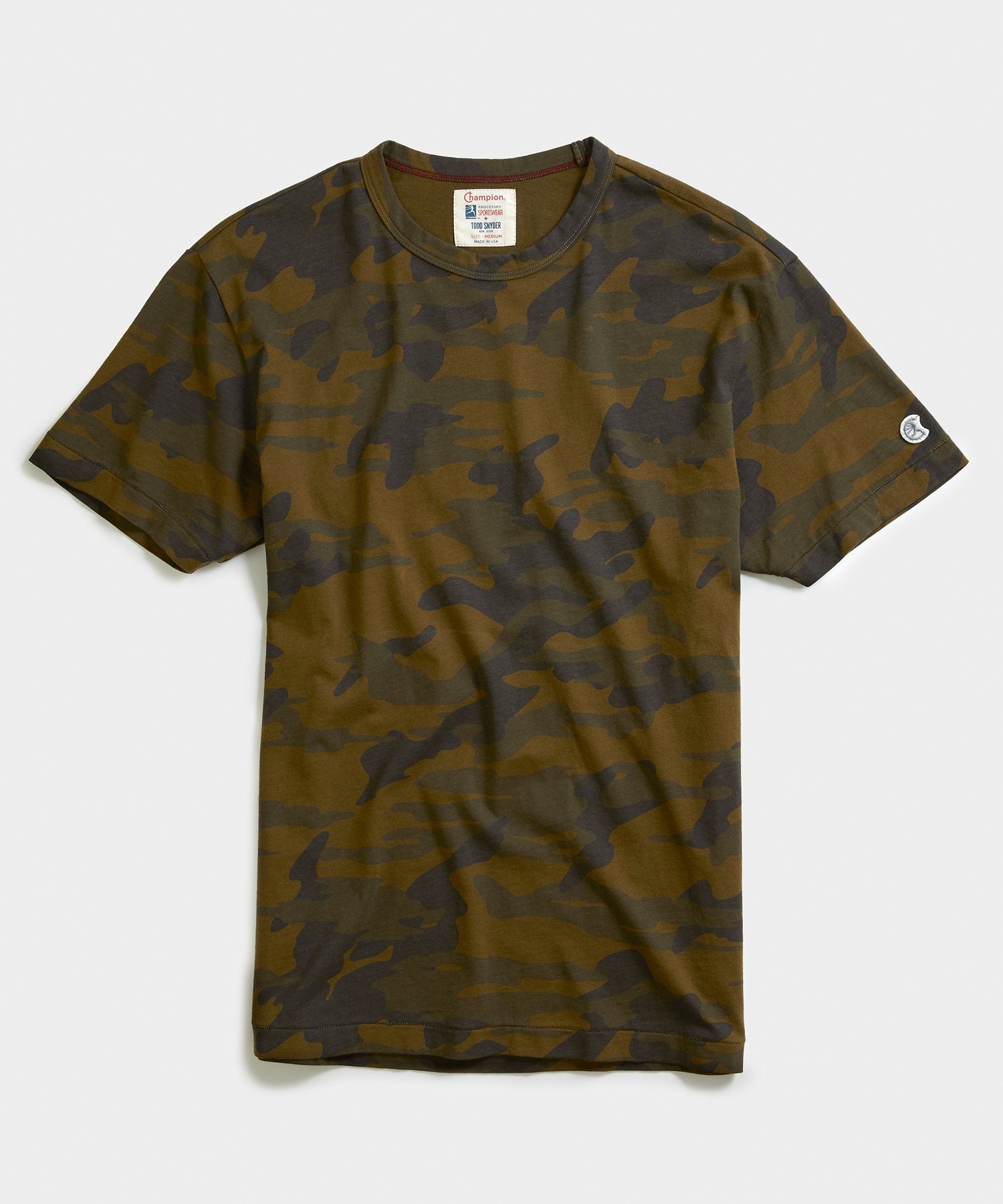 Part of our Foundation Collection — premium knitwear that plays equally well with sweats or suits — this essential fatigue camo tee is crafted from quality 9-oz cotton jersey in LA. Considered details such as red cover-stitching at the back of the neck, a self-fabric bound neck, contrast sand-colored stitching and the iconic logo nod to Champion’s athletic heritage while elevating an everyday basic. Softly tailored for a relaxed yet refined look, it looks great on its own or as your favorite base layer. Created in collaboration with iconic American athletic brand Champion Sportswear, and exclusively designed and manufactured by Todd Snyder.