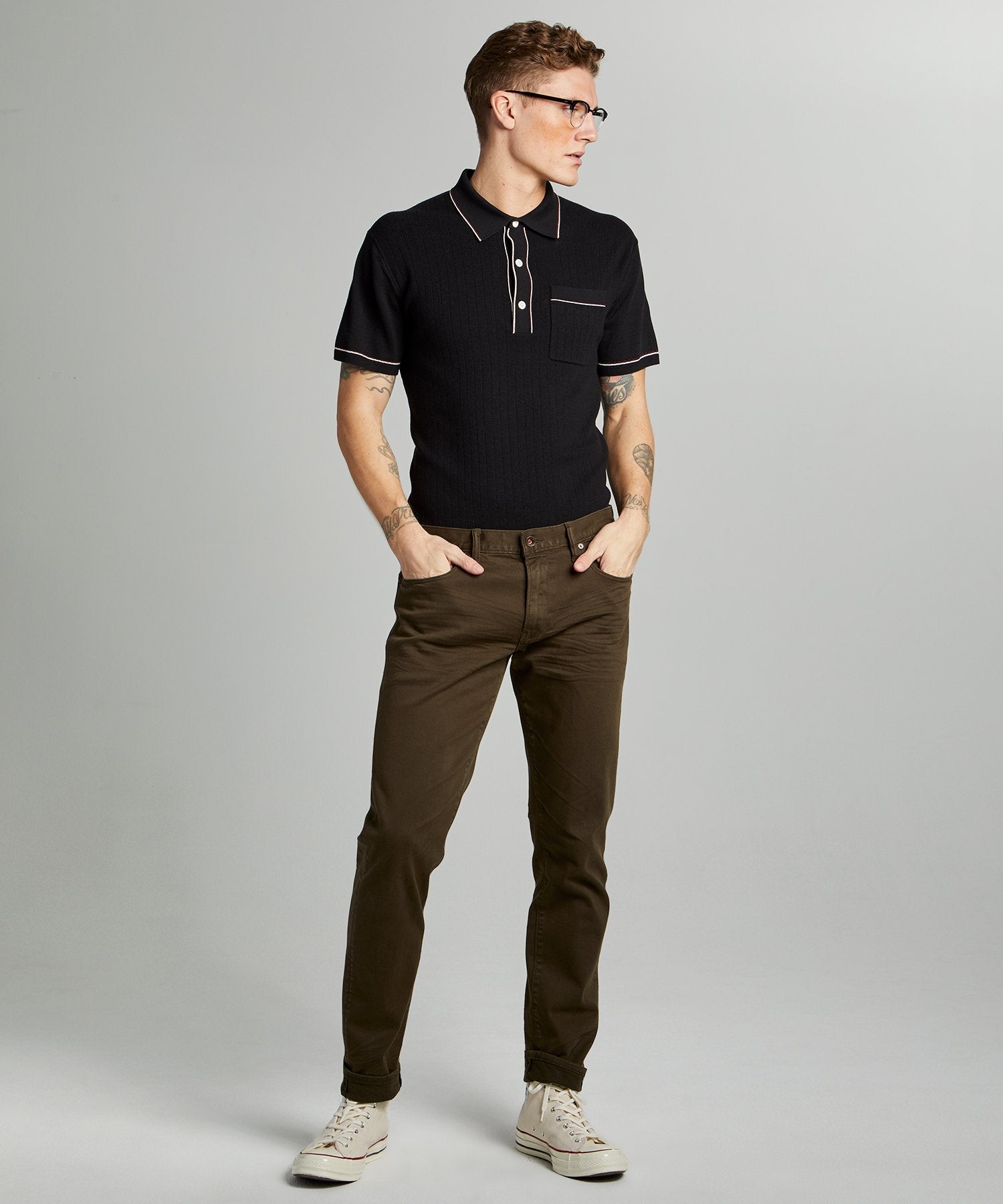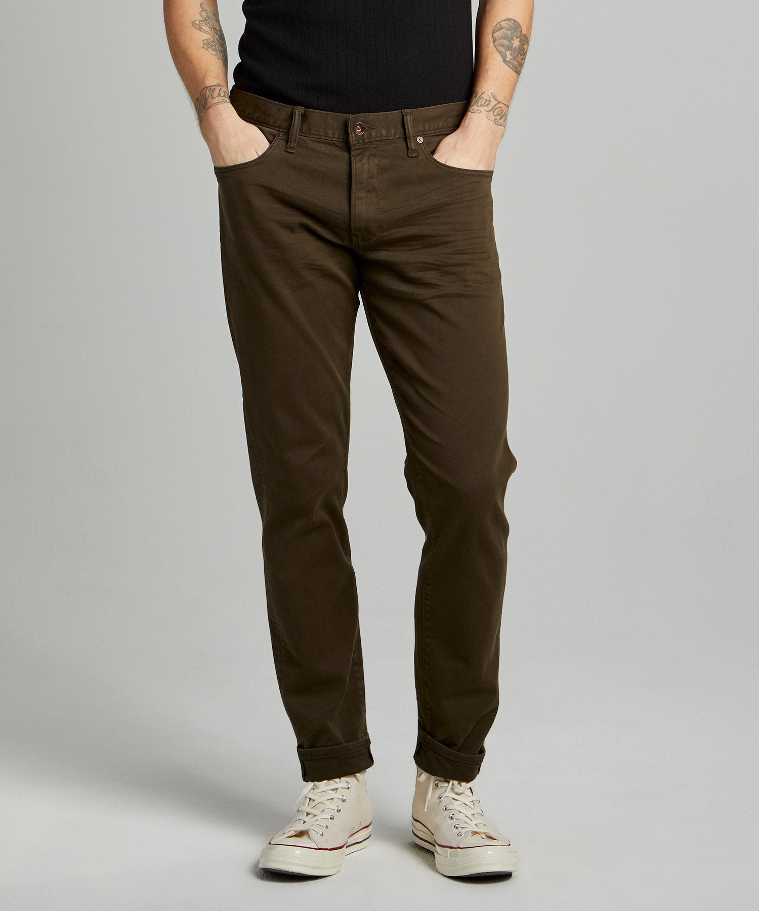 This modern hybrid merges the best features of your favorite denim and your trusty chinos into one truly perfect pair of pants. Crafted from garment-dyed twill with a touch of stretch, and tailored with a slim fit similar to our selvedge jean, the essential 5-Pocket Chino is casual yet elevated, comfy yet polished, and ready for just about anything. Leg tapers slightly from knee to hem; available in multiple inseams.