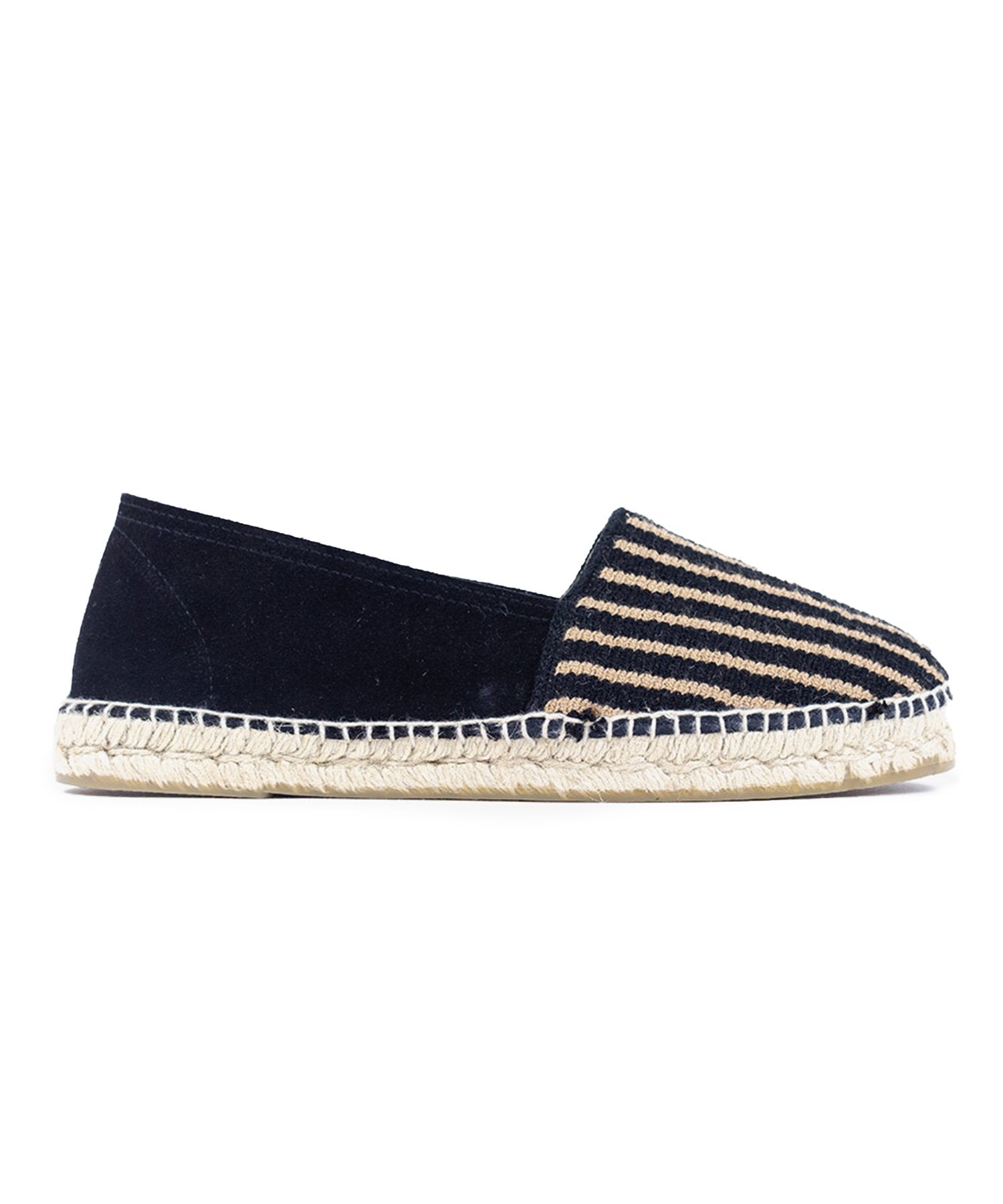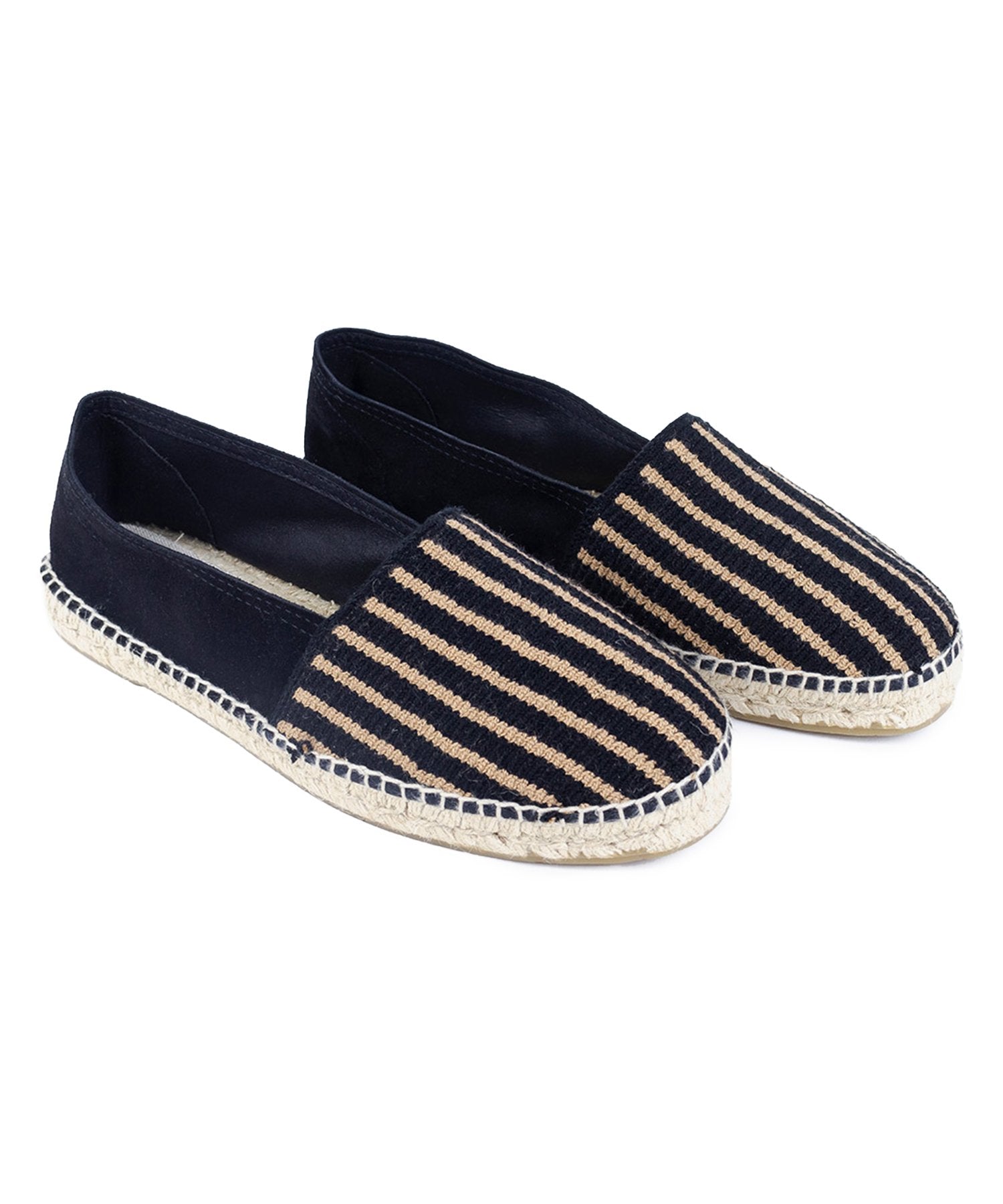Guanábana's espadrilles are a contemporary take on the traditional Spanish shape, patterned at the canvas vamp in navy and beige stripes. They’re handcrafted with supple suede panels at the heel and set on jute midsoles and rubber outsoles for assured traction.