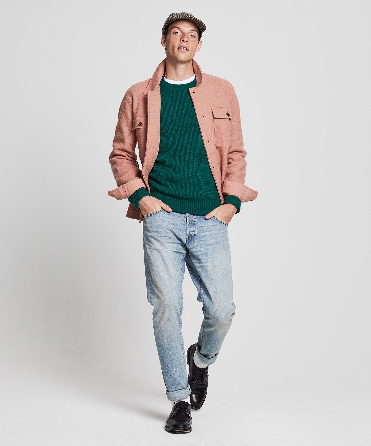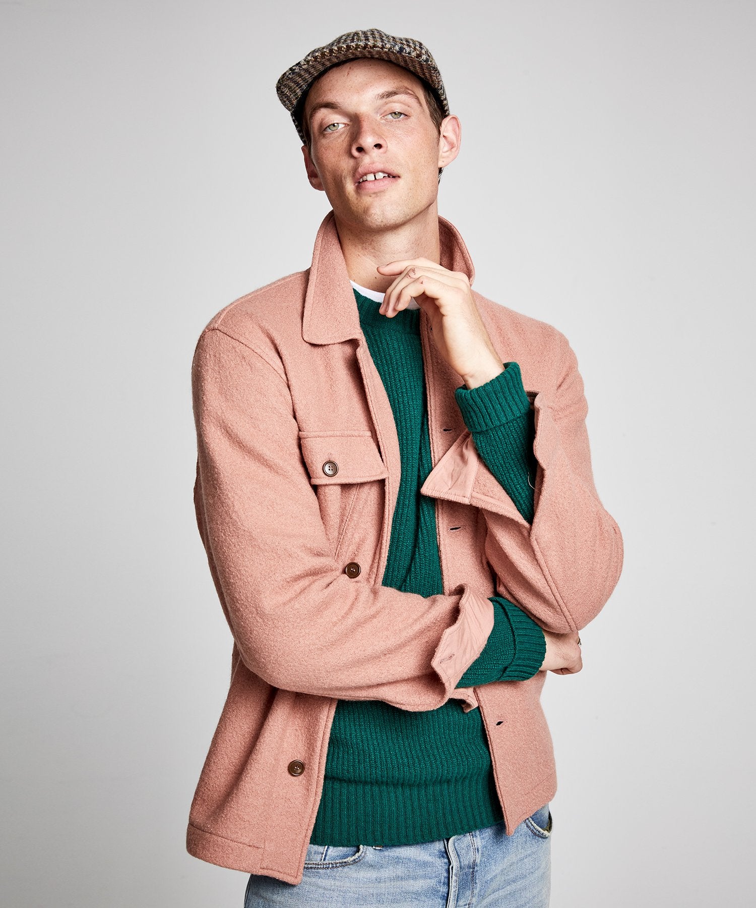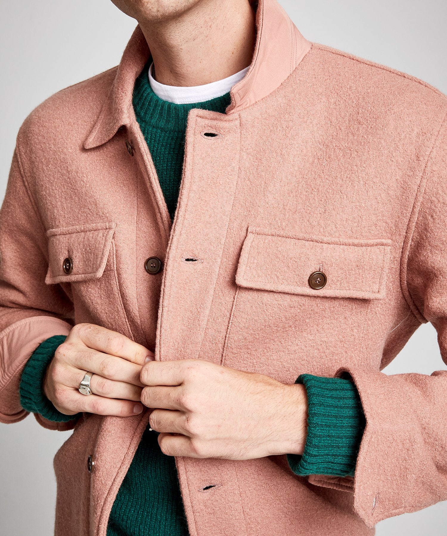 The perfect hybrid of jacket and knit, this versatile style mixes the vintage charm of a classic utility shirt with the ease of a favorite sweater. It is crafted with soft structure from a densely woven boucle that’s comfy yet hard-wearing, and finished with two patch and flap pockets at the chest, in true military fashion.