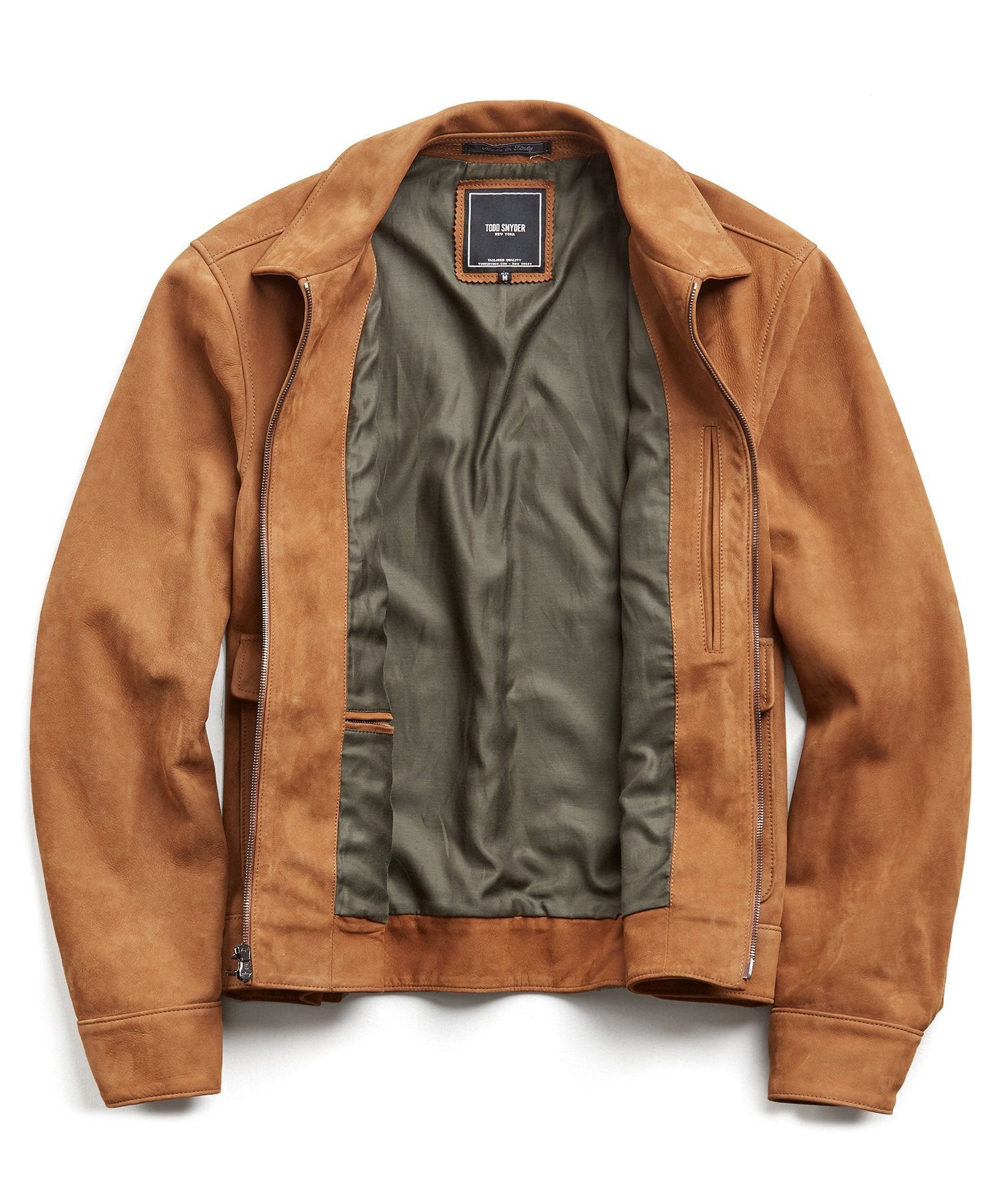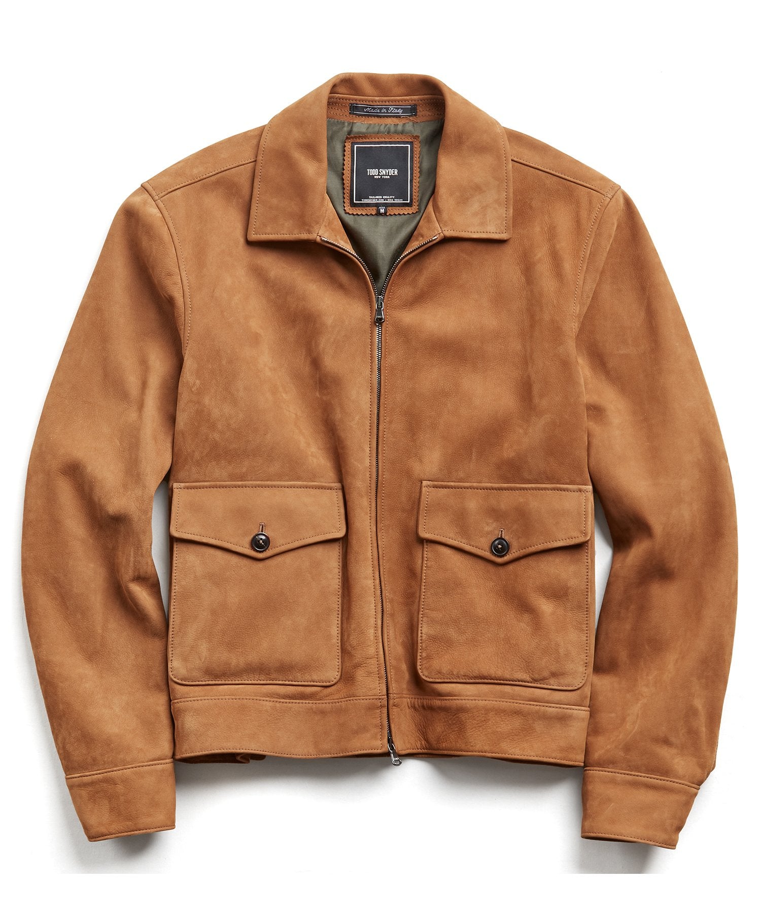 Crafted in 100% Nubuck calfskin leather from Italy this is an update on the classic aviator with luxe fabric and detailing. In rich caramel brown, this soft leather piece features exceptional tailored details like full signature Bemberg lining, patch and flap pockets, point collar, and a full-zip front with two-way zipper. An understated classic that will find it’s way into your everyday uniform for fall.