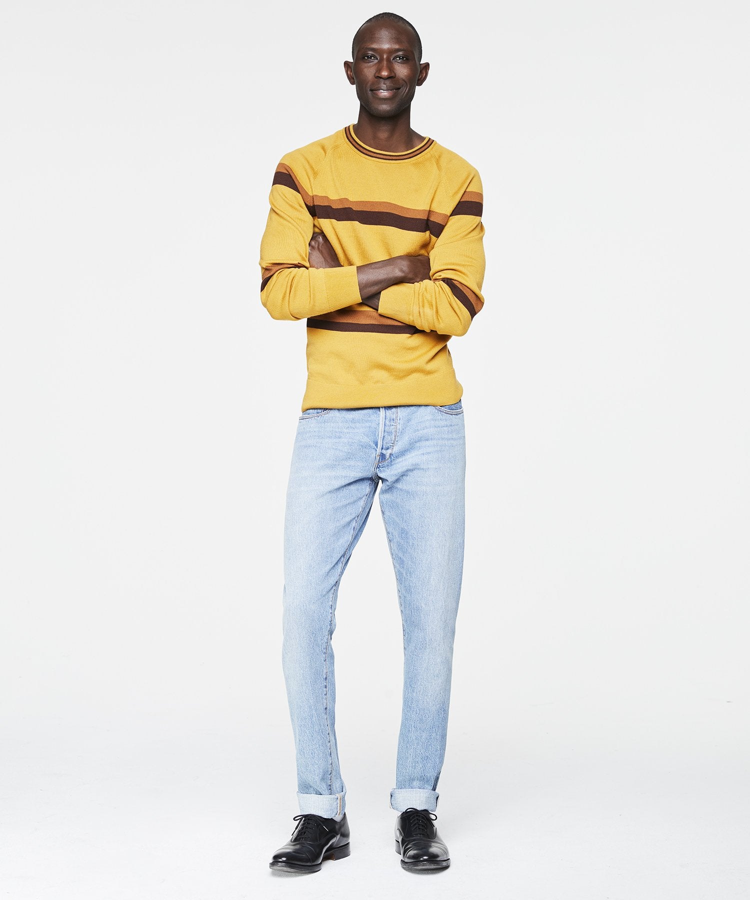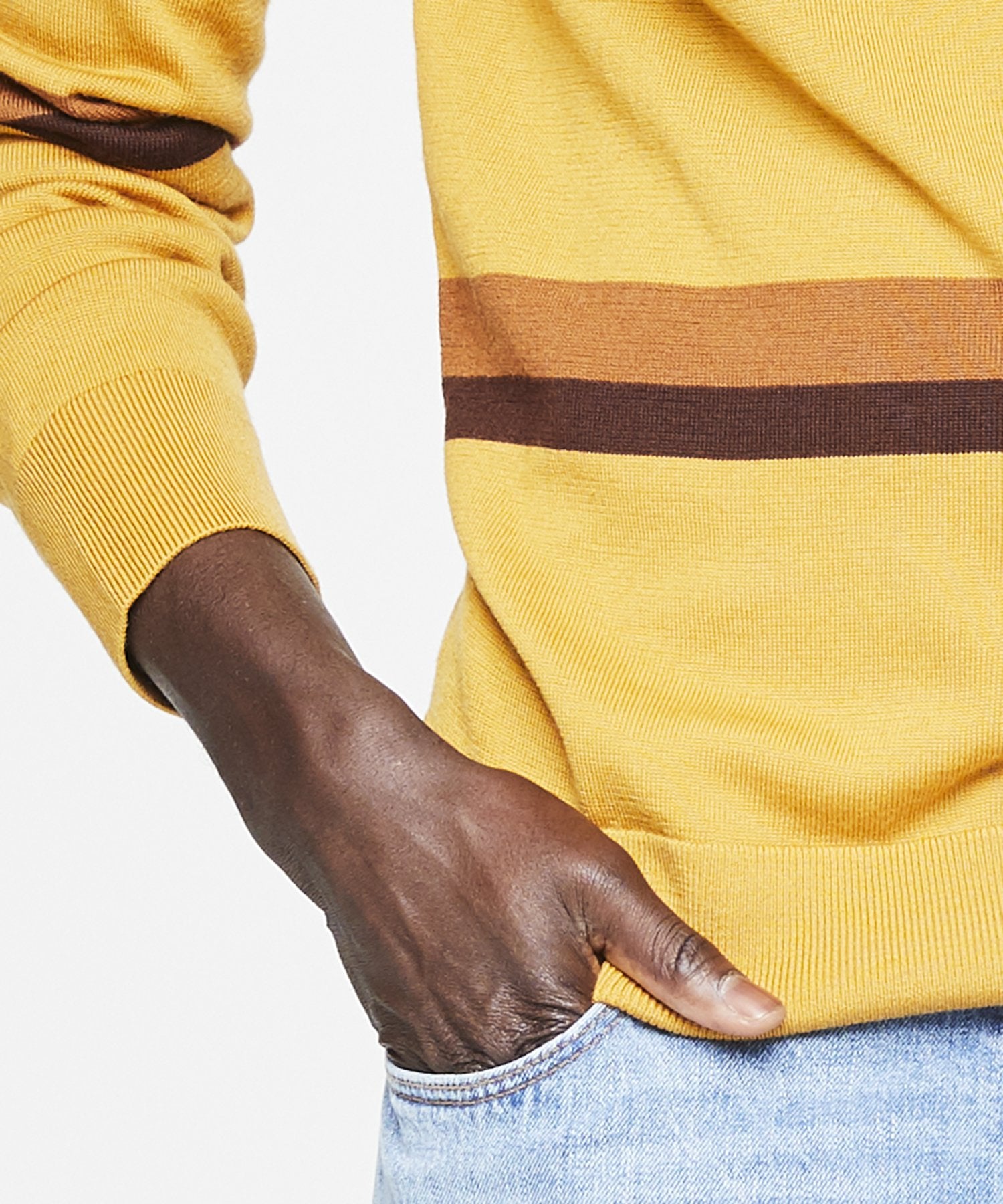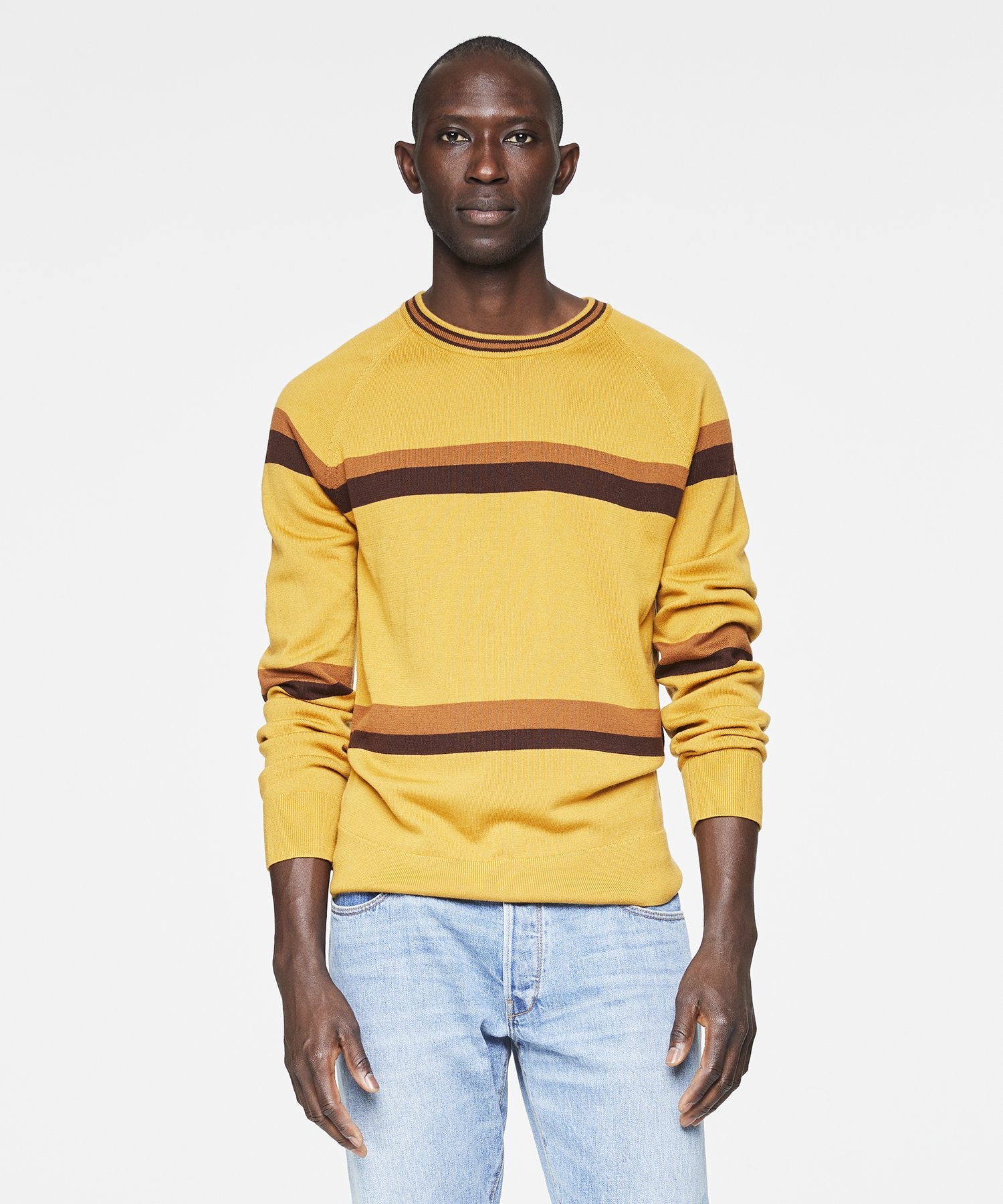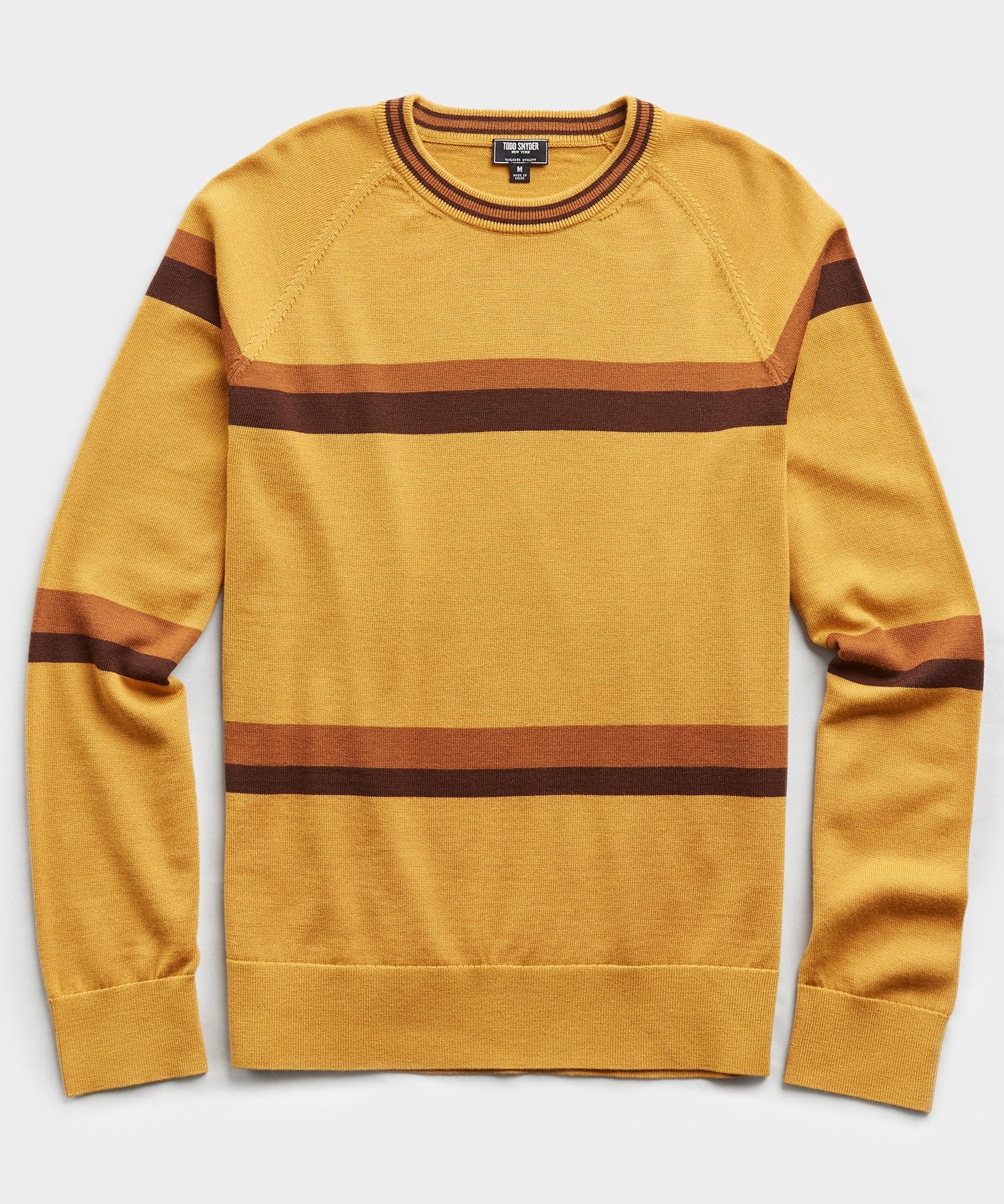 Made with 100% merino wool from Tollegno, the world famous Italian mill known for precious fabrics and sustainability-minded manufacturing, this is the ultimate sweater in virtually every way. Designed with Raglan armholes, engineered retro stripes, jersey stitching, and tipping at the neck. Fully fashioned with the remarkably versatile merino wool, the sweater makes for the ideal layer for keeping cool in the heat and cozy in the cold. An ideal density for layering, both beneath a coat or comfortably over a collared shirt.