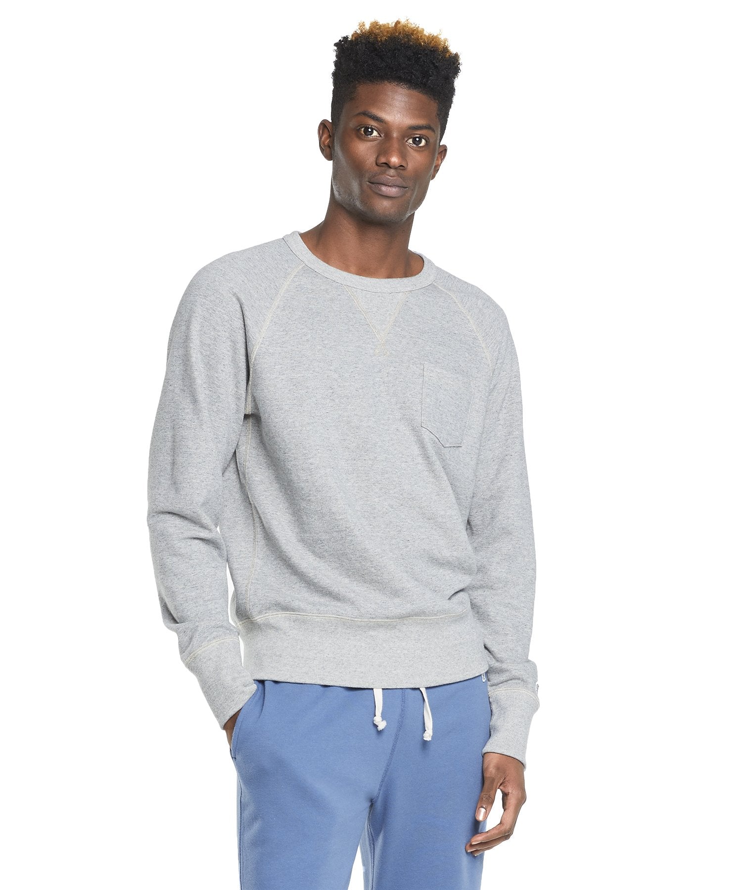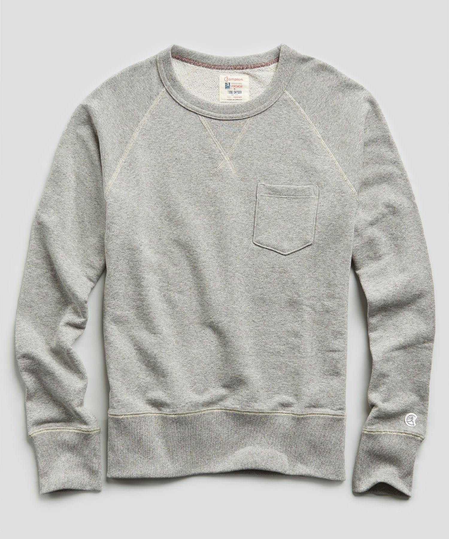 Part of our Foundation Collection — premium knitwear that plays equally well with sweats or suits — this raglan sleeve sweatshirt is crafted from softly structured French terry in a family-owned factory in Toronto. The left chest pocket is an iconic Champion detail, factory hand-cut and hand-pressed using a special mold prior to application. Each piece is weather garment dyed for a soft, unique finish. Created in collaboration with iconic American athletic brand Champion Sportswear, and exclusively designed and manufactured by Todd Snyder.