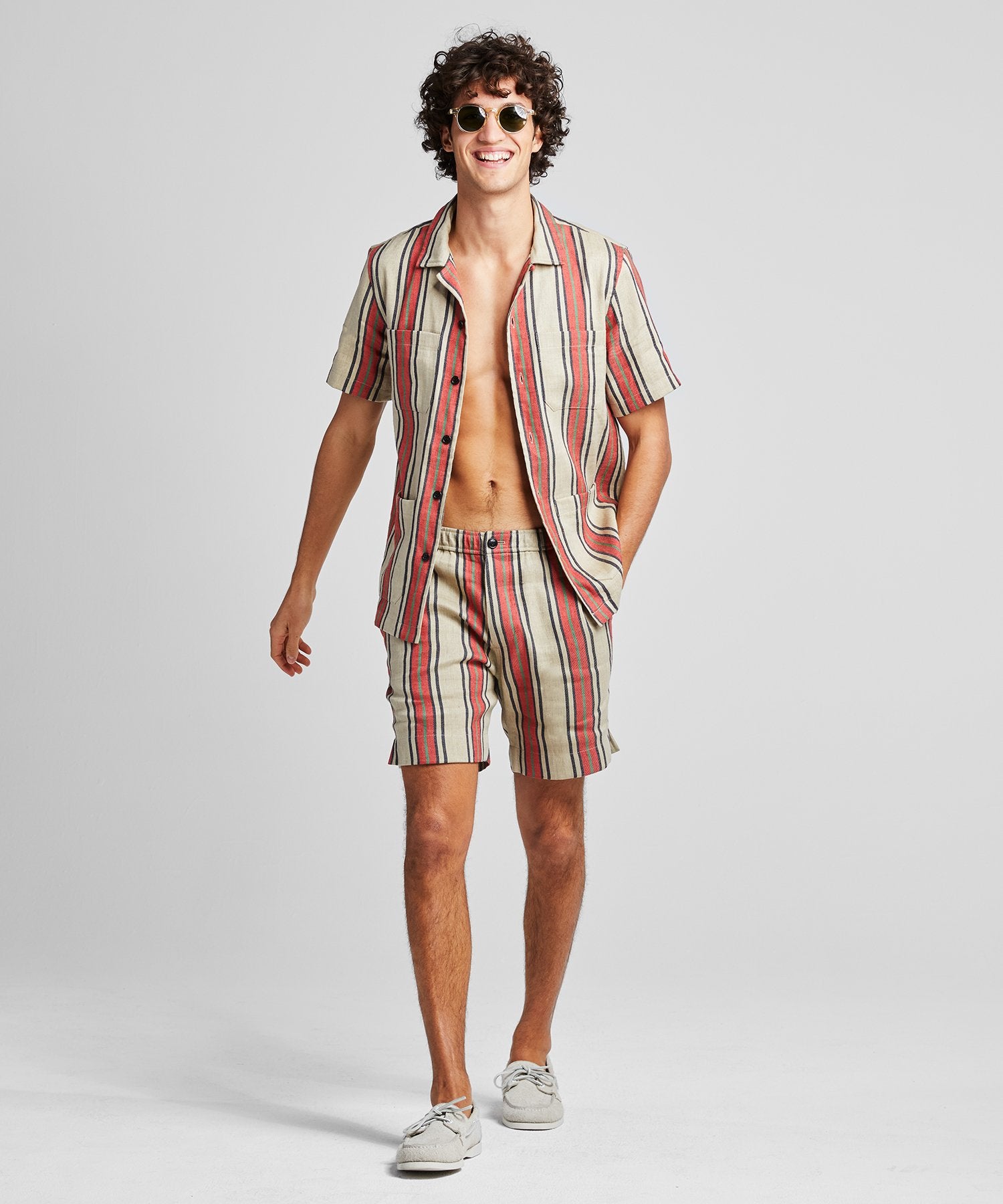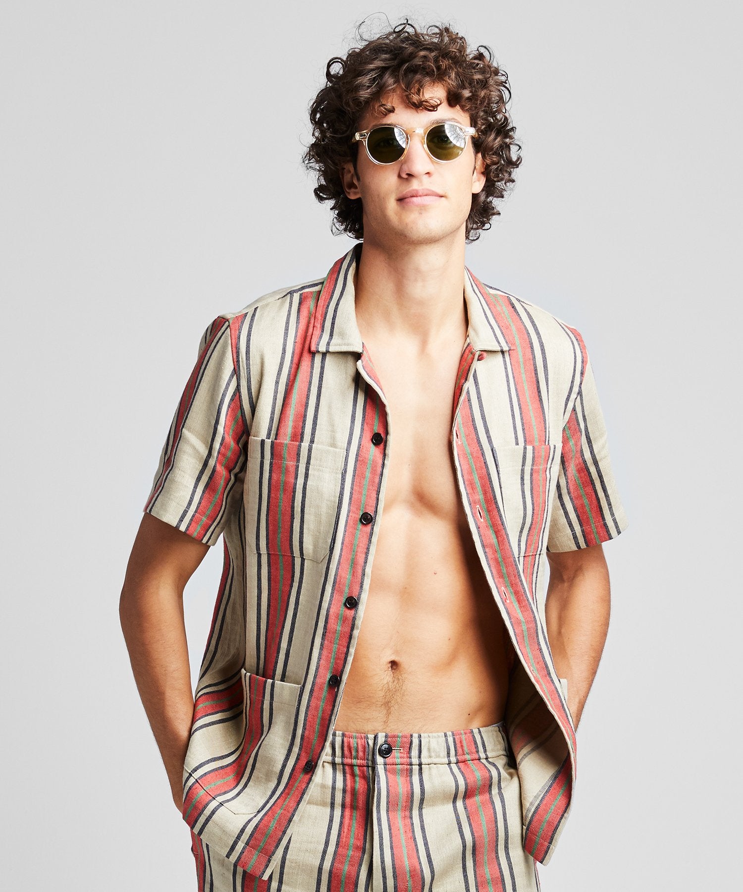 Based off mid-century cabana sets sold in the mad-men era, this style is the epitome of laid-back cool. Made in an awning stripe pattern from premium Italian cotton linen and our signature camp collar, this style is perfect for making a statement from a backyard barbecue to the beach.