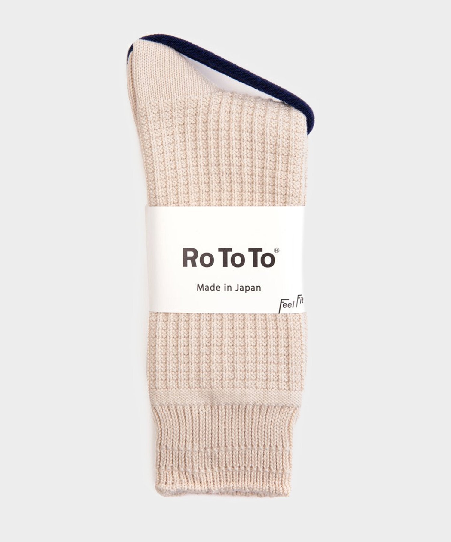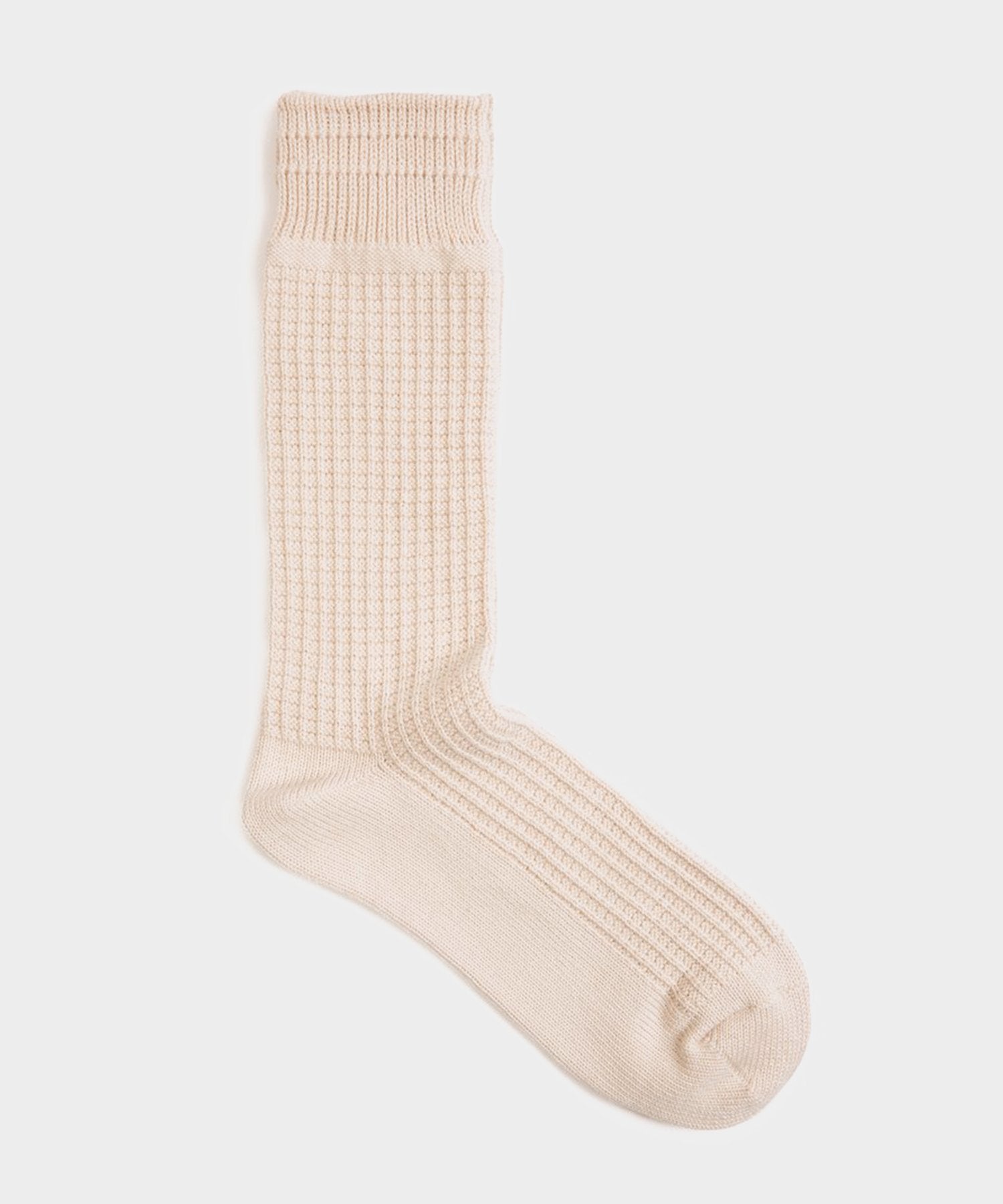 These waffle-textured RoToTo socks are woven in Japan from a soft cotton blend. In an understated ivory hue, they feature a ribbed cuff and a hand-linked toe box.