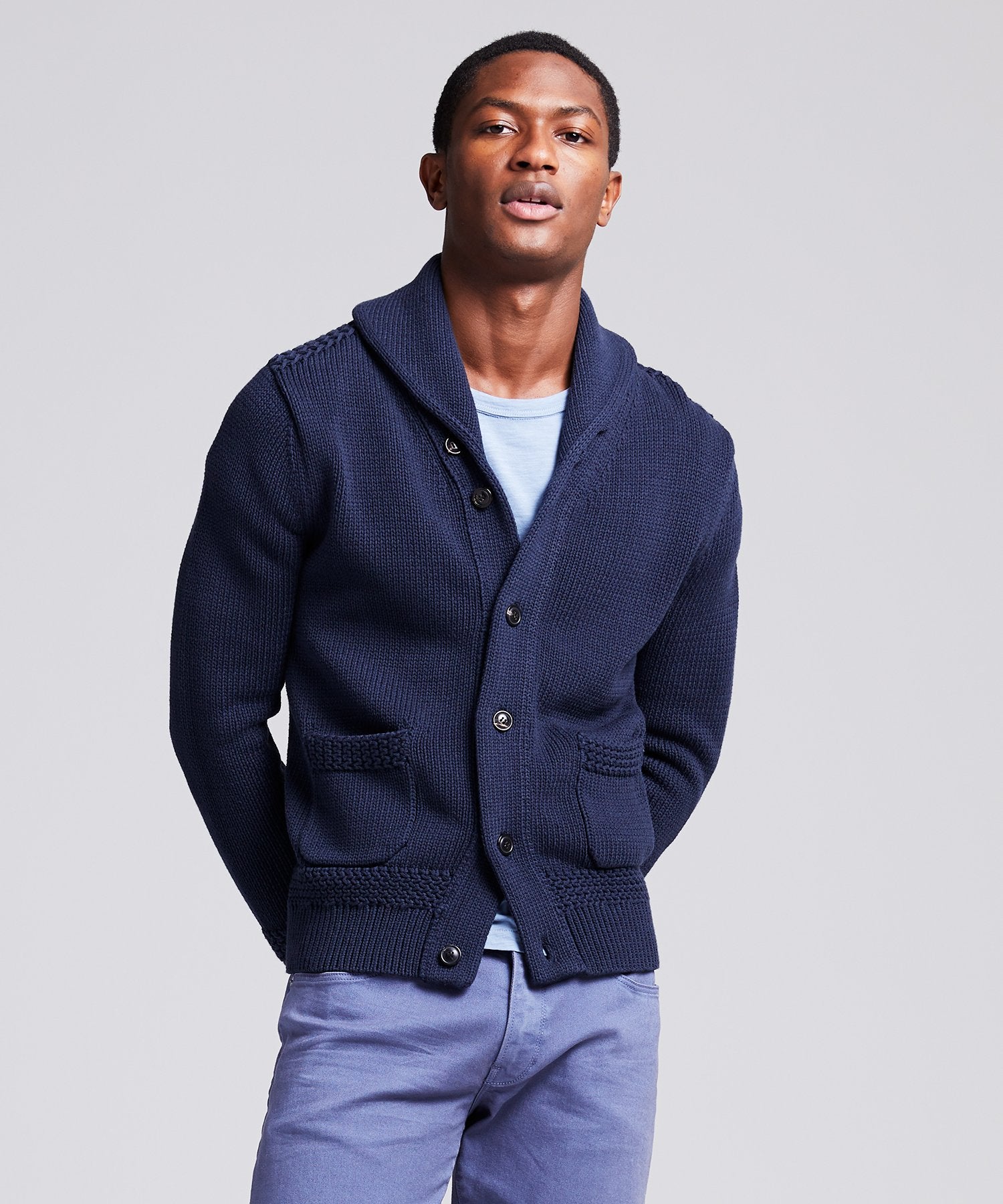 Made from premium Italian cotton-linen yarn, our shall cardigan comes with elevated construction like a half-cardigan textured stitch, double layer shawl collar, rib cuffs and waistband with lycra for retention. Wear it as an alternative to your tailored jacket on more casual days, or thrown over just about anything.