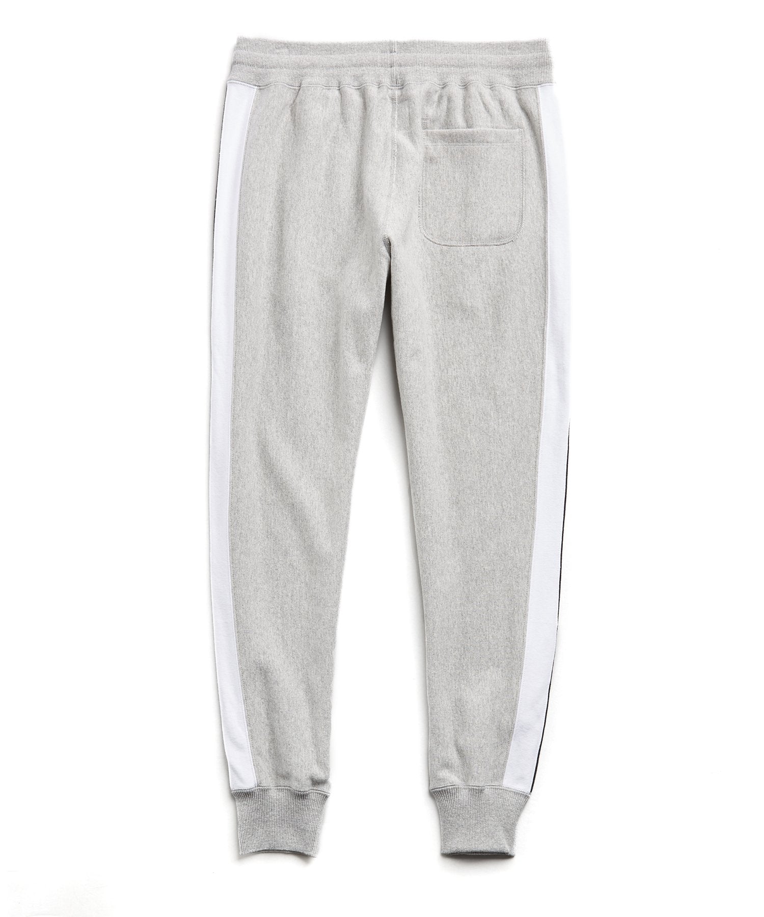 A more closely cut version of our classic sweatpant, it features applied jersey side stripes for a lived-in texture and a unique, well-loved look. Made in Canada from 20-oz. French terry, it’s finished with ribbed cuffs, two side seam pockets, and elasticated waist with exterior drawcord. A perfect match with the double stripe raglan sweatshirt or paired with a tee and button down for a riff of street smart style. Created in collaboration with iconic American athletic brand Champion Sportswear, and exclusively designed and manufactured by Todd Snyder.