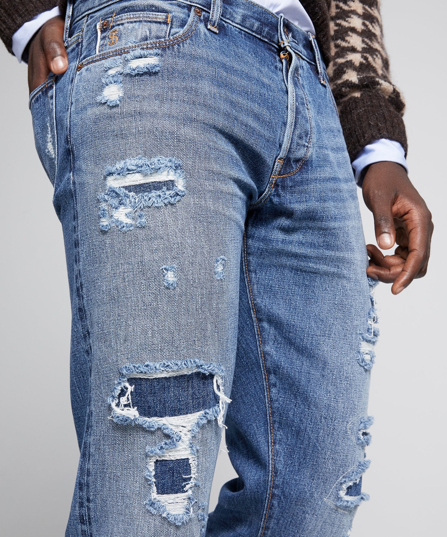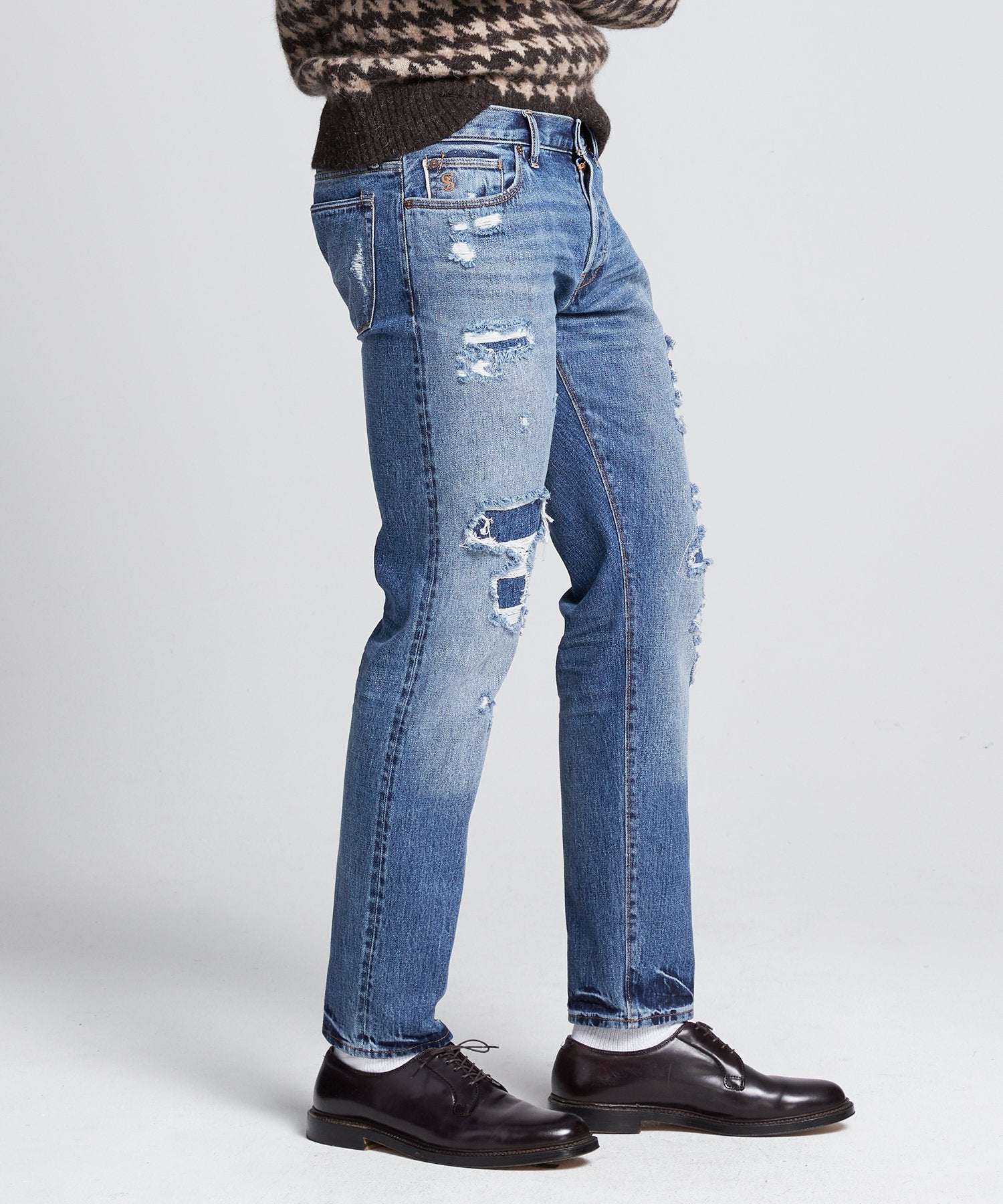Slim Fit Selvedge Destroyed and Repaired Denim Jean