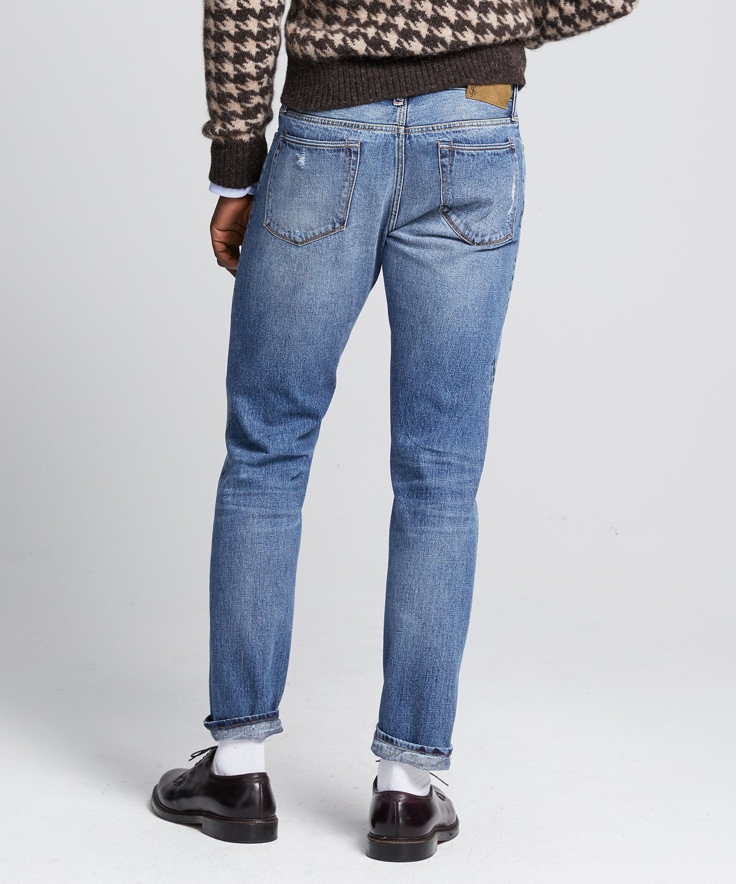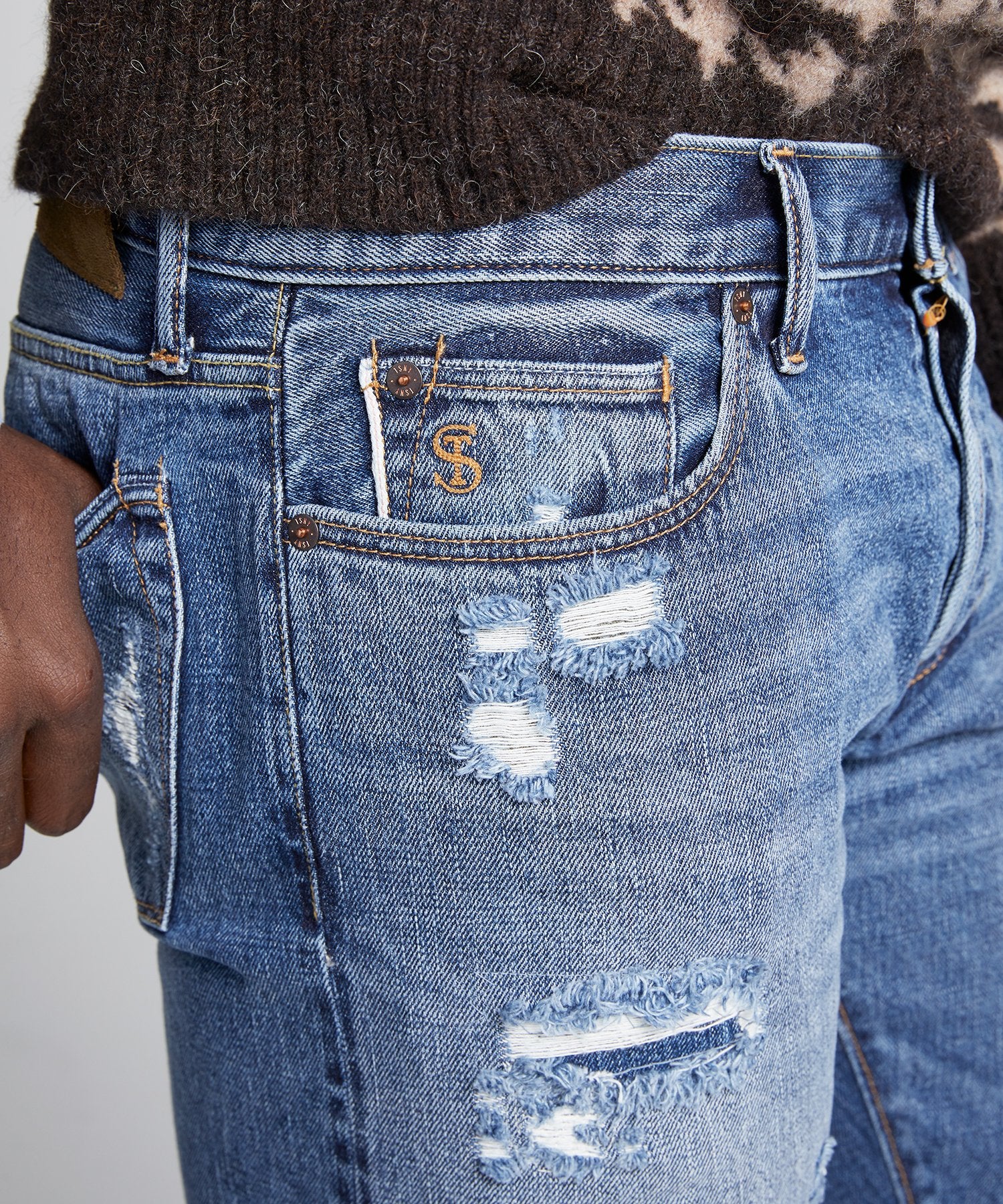 Our selvedge jean is cut with a modern slim fit from premium Japanese stretch denim with authentic destroy and repair details, replicated after studying vintage denim. Softer than our other jeans and styled with a button fly, this signature style is our take on the American icon, destined to get even better with age.