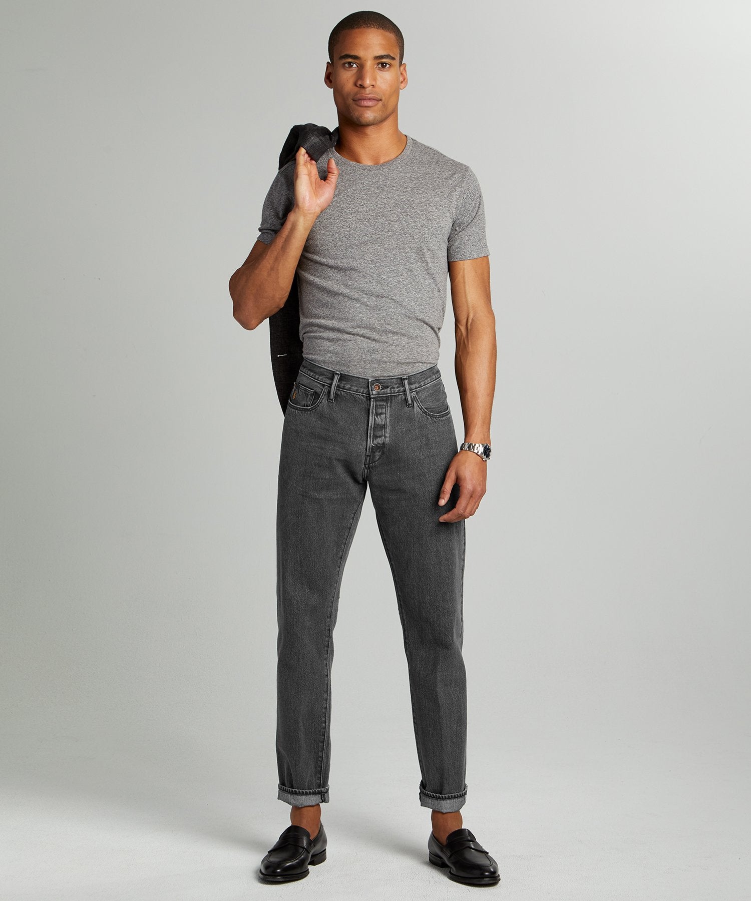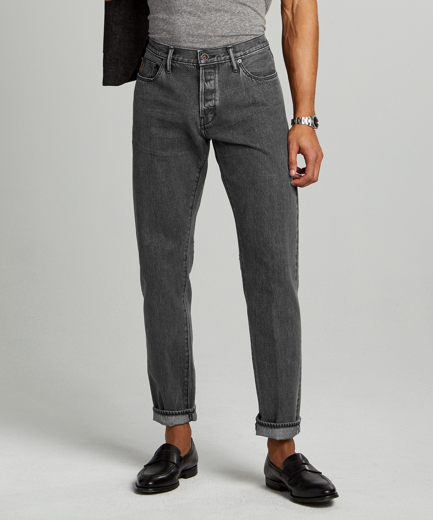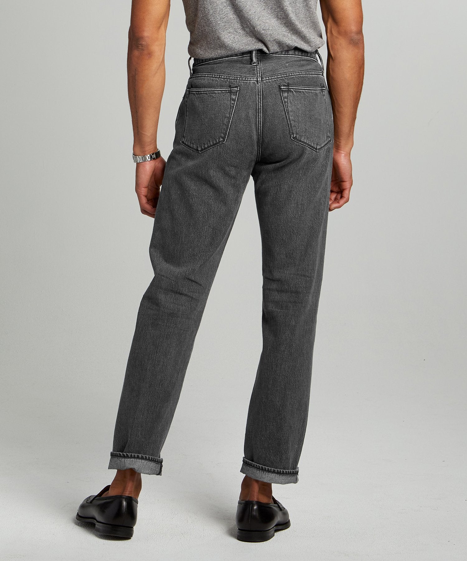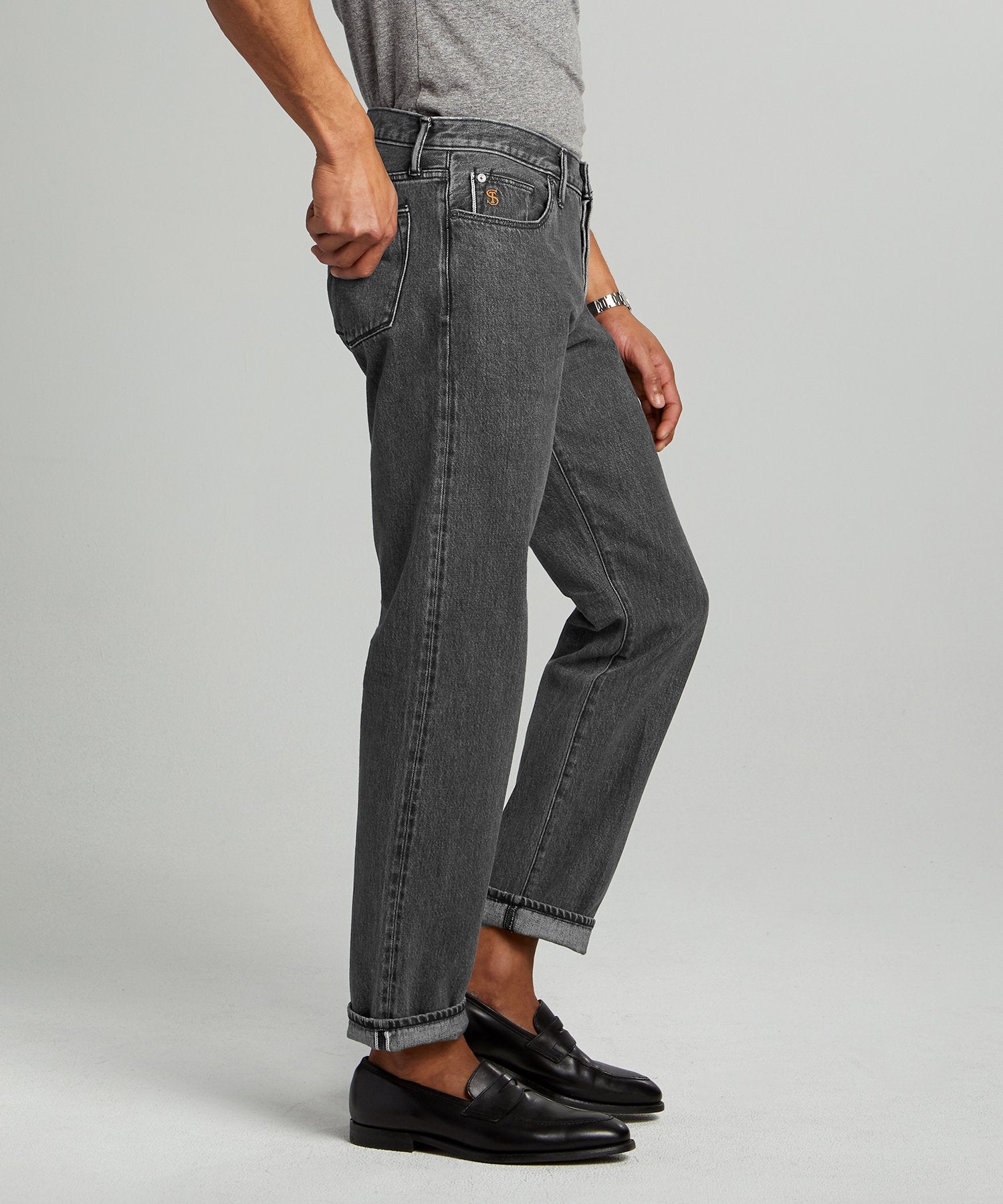 Cut with a new custom straight fit from premium Japanese stretch selvedge fabric. The authentic worn-in look features signature detailing; three-color topstitching, handmade durable herringbone pocketing, branded inner pocket, and Todd Synder-embossed suede back patch. Styled with a button fly, this new signature style is our take on the American icon, destined to become a new favorite in your denim collection.