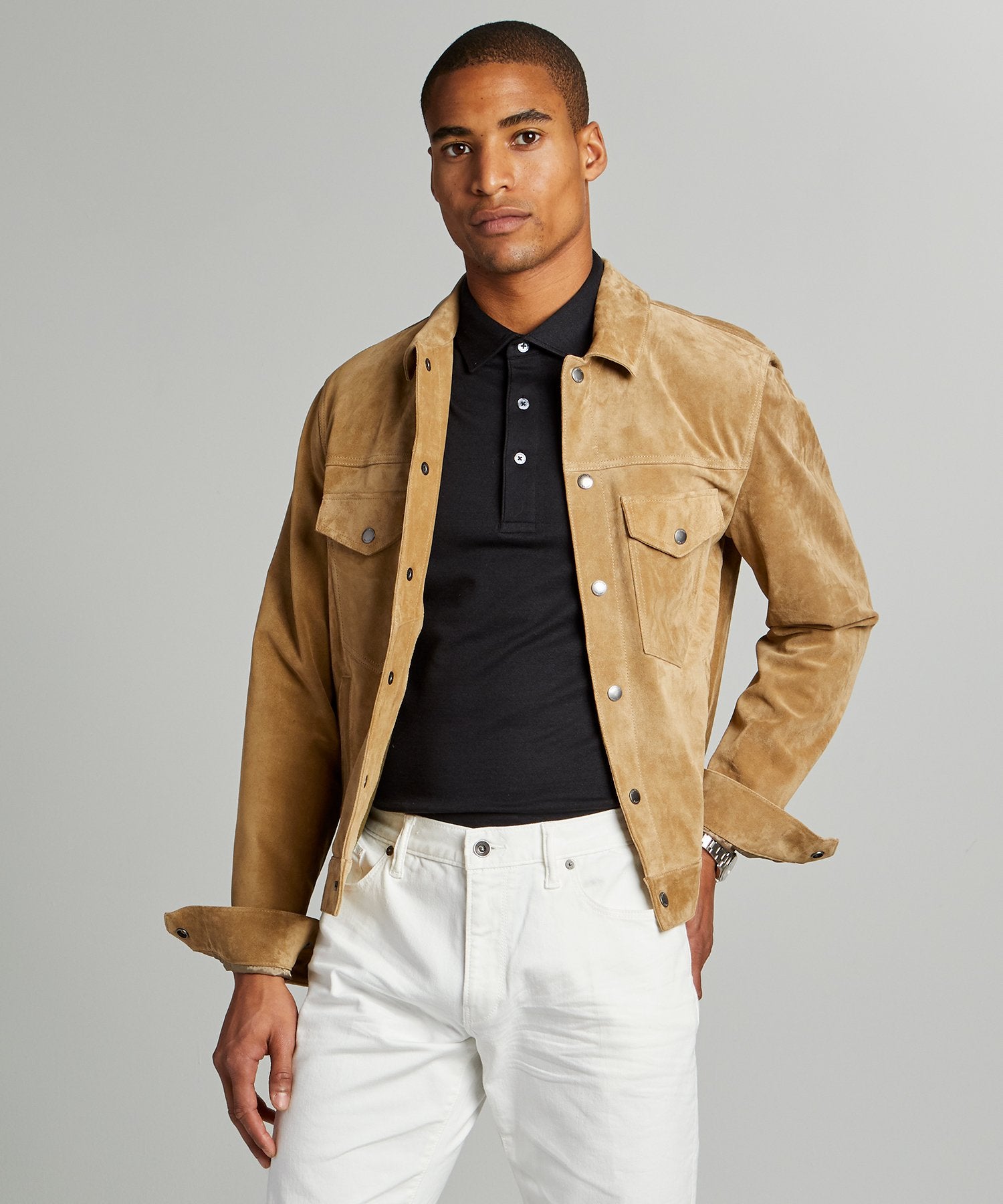 A timeless classic piece with a modern sensibility. We’ve given our signature suede Dylan jacket an upgrade in an array of new sunset colors. This luxe layer — made in Italy— combines classic styling with an elevated material that will add sophistication to any look. Detailed with two button-through patch pockets and two lower slant pockets, and constructed with a trim fit.