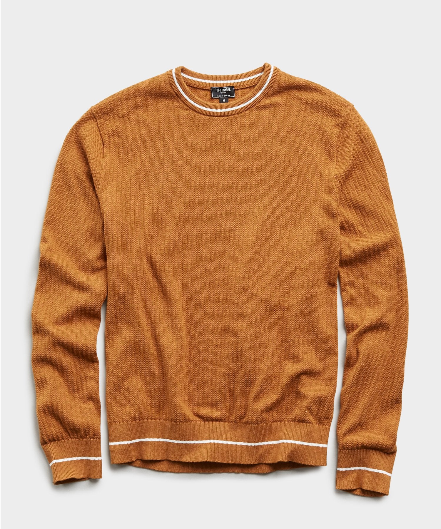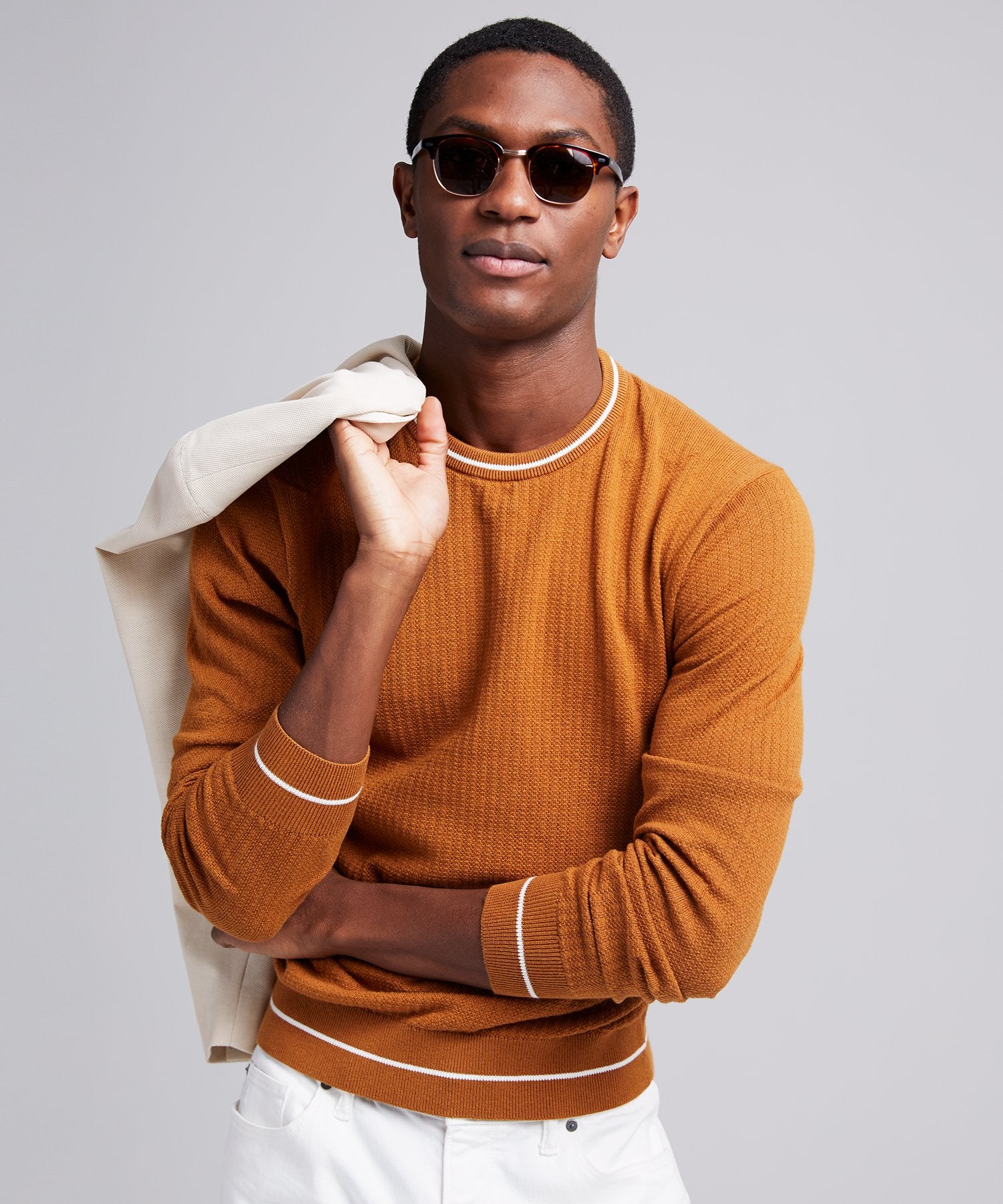 Styled in a variety of colors, this is the go-to cotton sweater to stock up on for spring. Made from 100% premium cotton, it’s fashioned with a textured stitch on the body and sleeves along with a tipping stripe on the neck, waist, and cuffs for a true retro feel. Pair with selvedge denim and your fave kicks for weekend dates or with tailored pants for an effortlessly stylish work-fit.