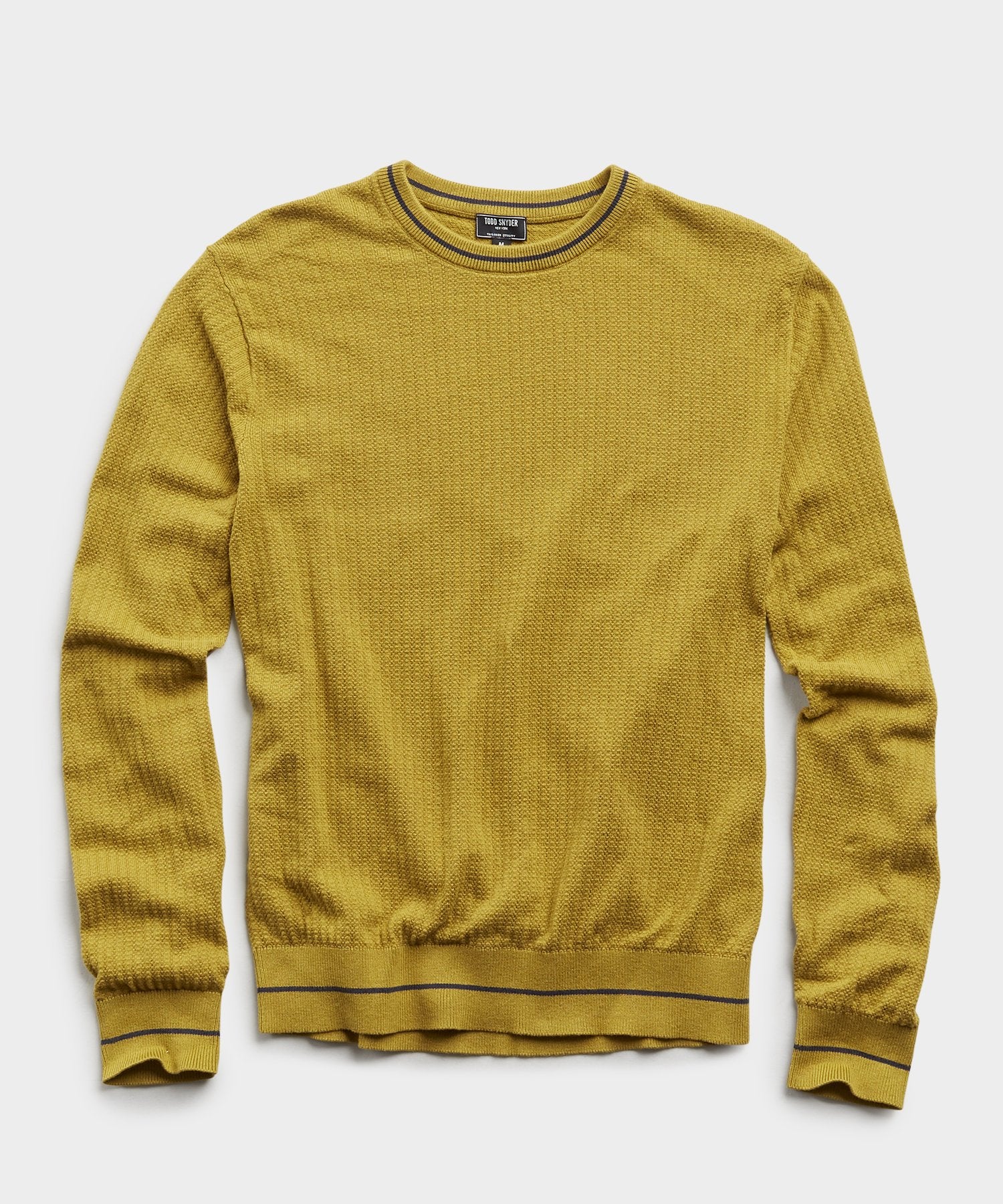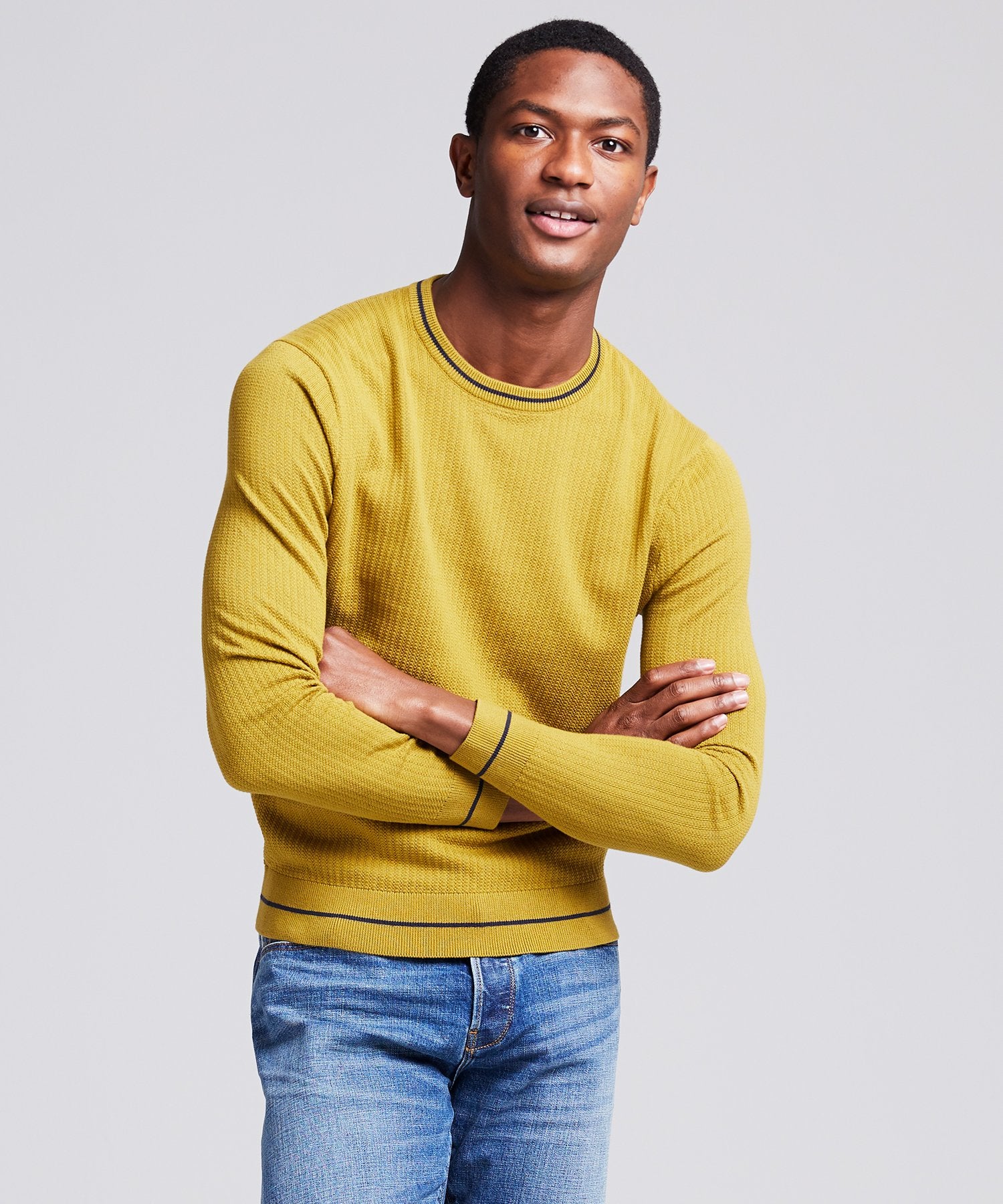 Styled in a variety of colors, this is the go-to cotton sweater to stock up on for spring. Made from 100% premium cotton, it’s fashioned with a textured stitch on the body and sleeves along with a tipping stripe on the neck, waist, and cuffs for a true retro feel. Pair with selvedge denim and your fave kicks for weekend dates or with tailored pants for an effortlessly stylish work-fit.