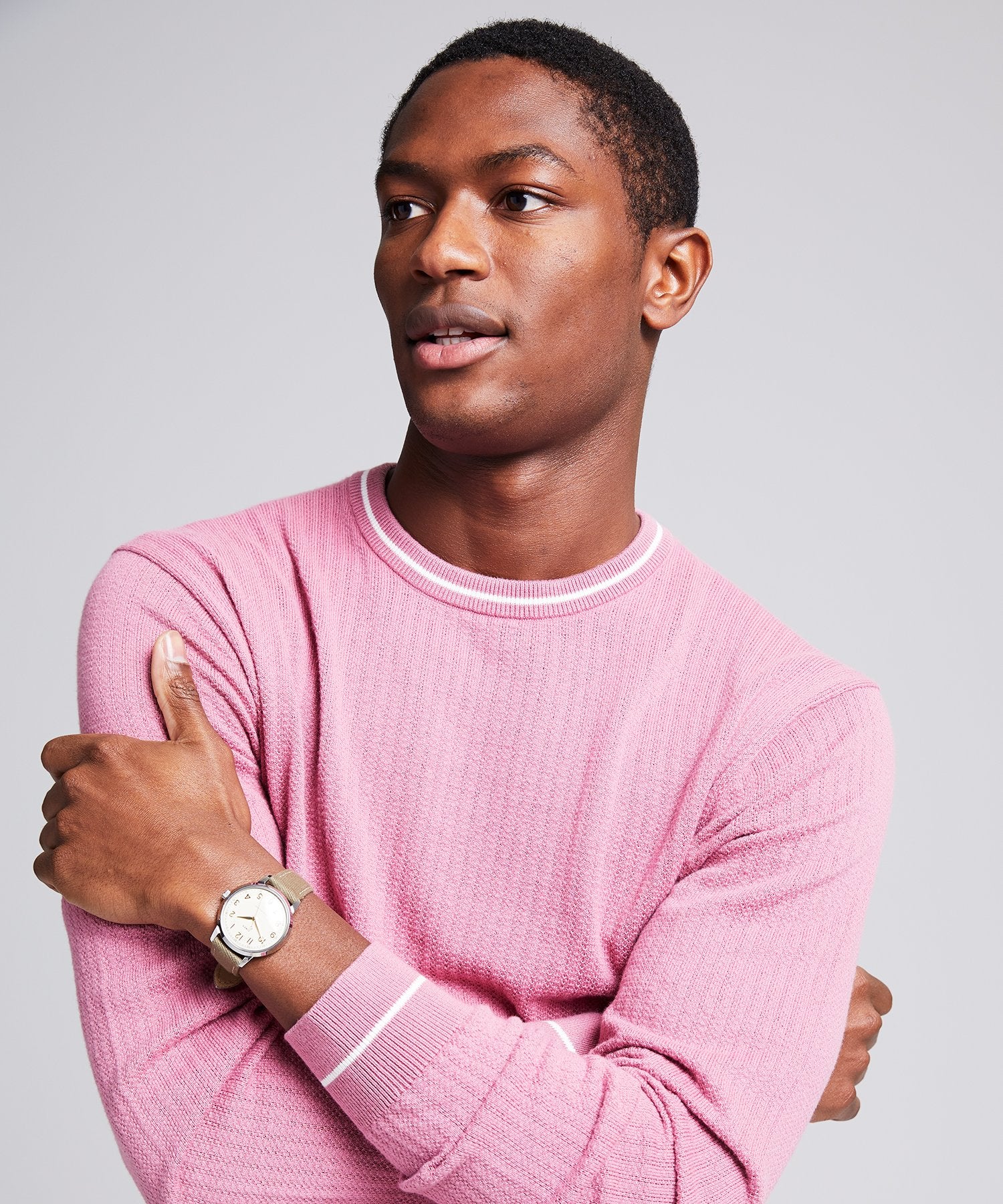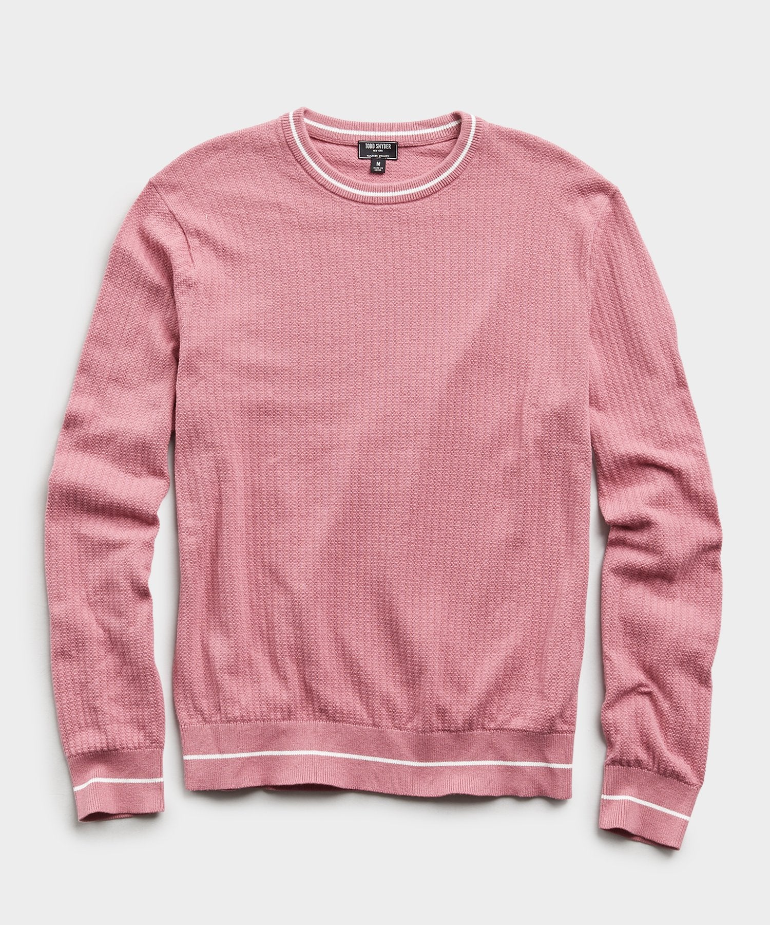 Styled in a variety of colors, this is the go-to cotton sweater to stock up on for spring. Made from 100% premium cotton, it’s fashioned with a textured stitch on the body and sleeves along with a tipping stripe on the neck, waist, and cuffs for a true retro feel. Pair with selvedge denim and your fave kicks for weekend dates or with tailored pants for an effortlessly stylish work-fit.