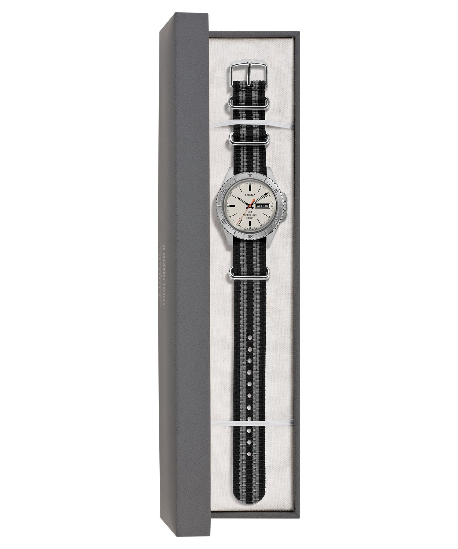 Todd Snyder and Timex continue their ongoing design partnership with the brand new MS1 Maritime Sport, a modern hybrid with a nautical sensibility that evokes naval academies and life on the eastern seaboard. Developed across the Atlantic, in Milan, by Snyder and Timex Design Director Giorgio Galli, it pays homage to iconic diver styling with a fresh look that’s equally at home in Nantucket or New York.