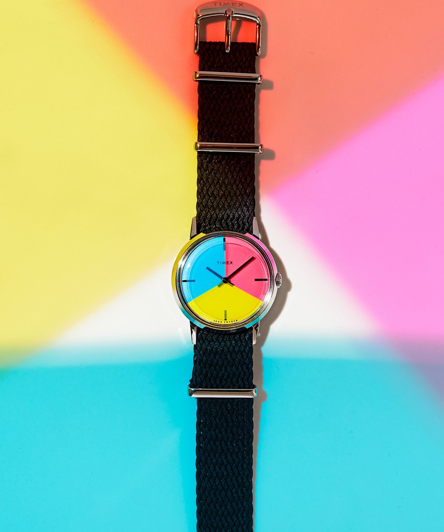 It seemed the perfect watch to celebrate Pride because love comes in all colors of the rainbow and in all different orientations. “I had been doing research in the Timex archive and when I saw this watch from the Seventies with the multi-colored disks, I wanted to refresh it and make it a celebration of Pride,” says Snyder. “Pride is obviously about love and inclusiveness, and the different colors of the watch embody that.”
