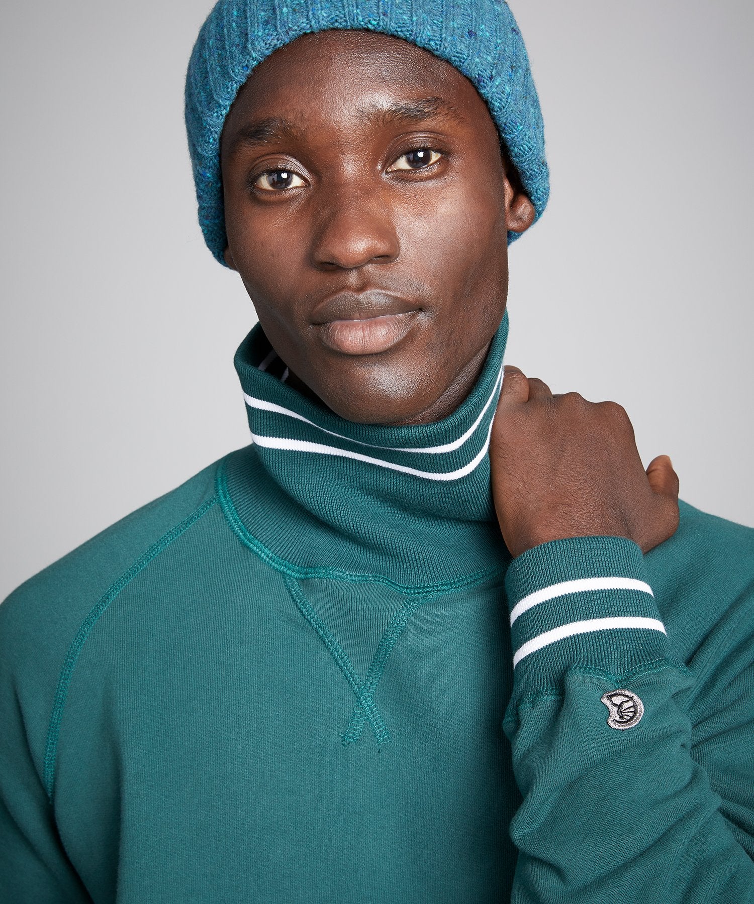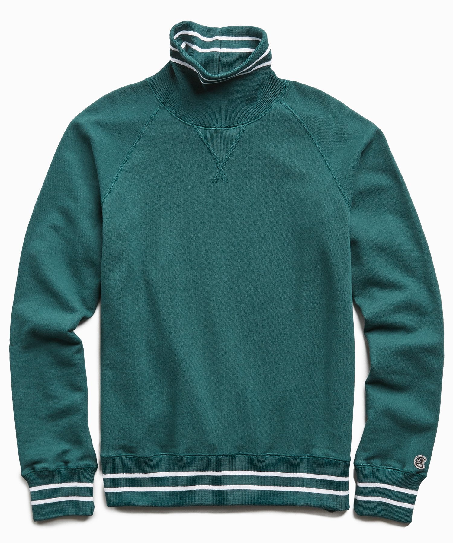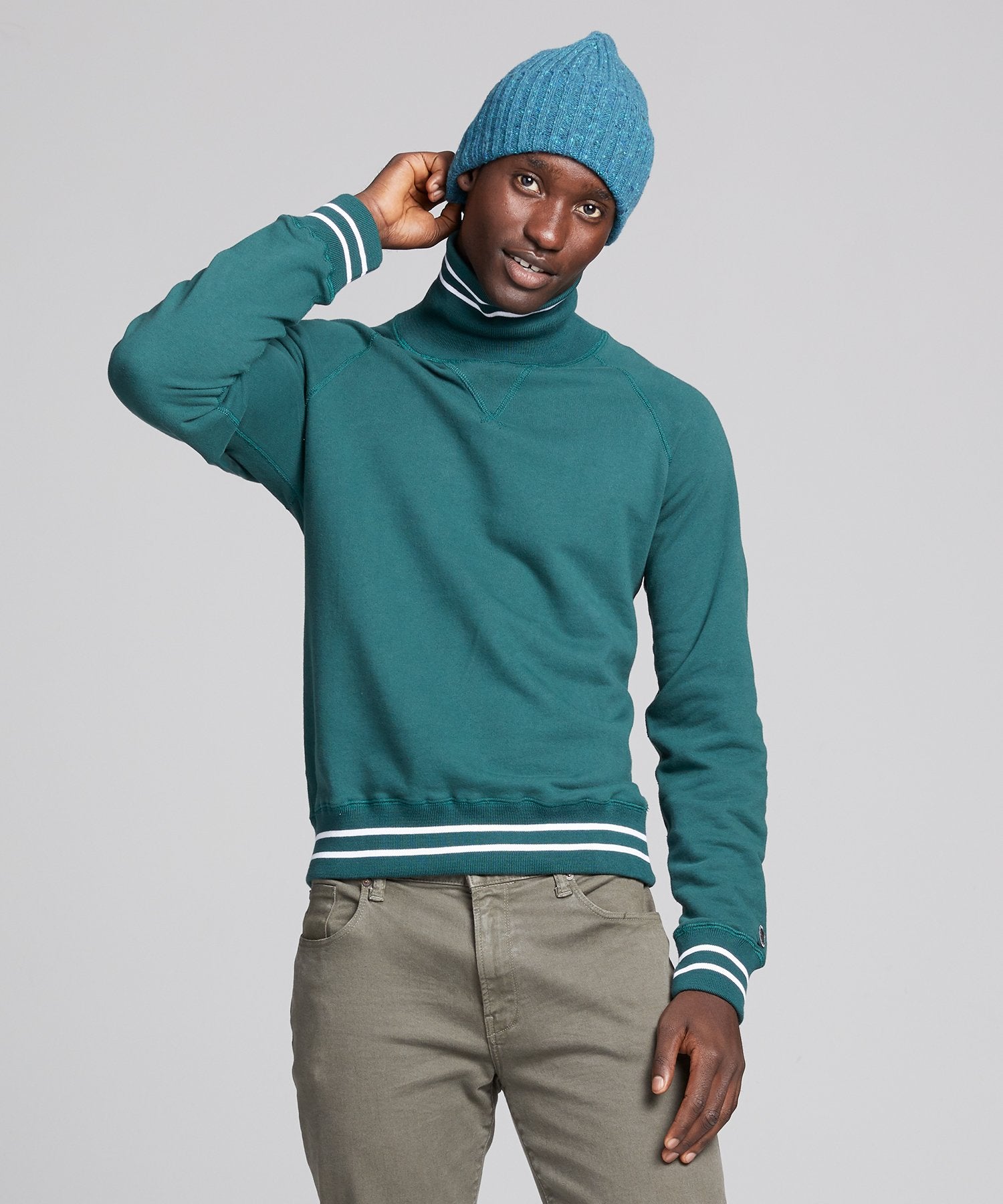 Up your fall look with an elevated spin on the essential turtleneck. Crafted from 16-oz. French terry for superior comfort and lends itself to a variety of seasonal wear. Features contrast striped tipping at the collar, cuffs, and waistband, a raglan sleeve and classic roll-turtleneck styling. Tuck into a tailored pant for a spin on tradition or pair with selvedge denim and sneaks for an effortless weekend ensemble.