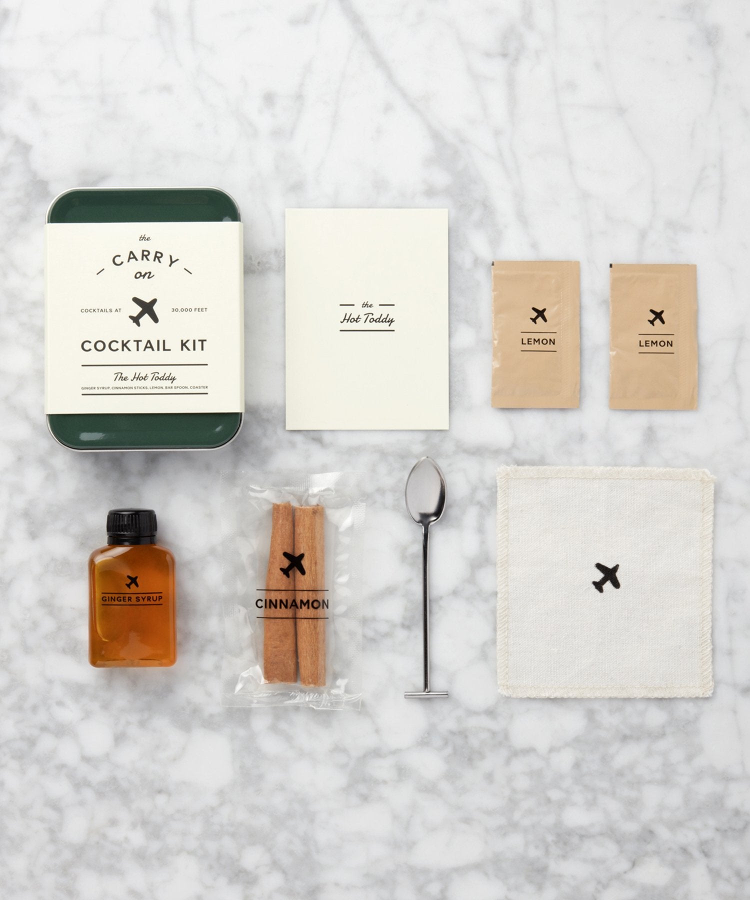 This kit includes the tools to craft two Hot Toddy cocktails mid-flight: small-batch ginger syrup, all natural lemon packets, cinnamon sticks, a travel-size bar spoon, a recipe card and a linen coaster. Just add the hard stuff and stir.